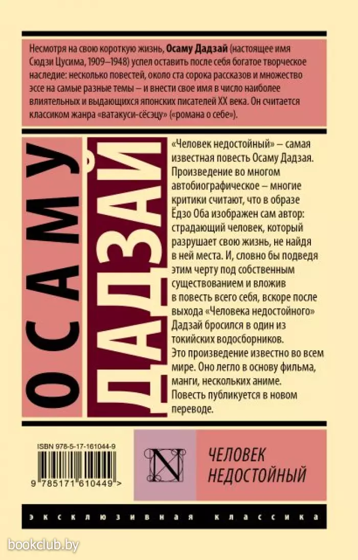 "Человек недостойный" – самая известная повесть Осаму Дадзая. Произведение во многом автобиографическое – многие критики считают, что в образе Ёдзо Оба изображен сам автор: страдающий человек, который разрушает свою жизнь, не найдя в ней места. И, словно бы подведя этим черту под собственным существованием и вложив в повесть всего себя, вскоре после выхода "Человека недостойного" Дадзай бросился в один из токийских водосборников.