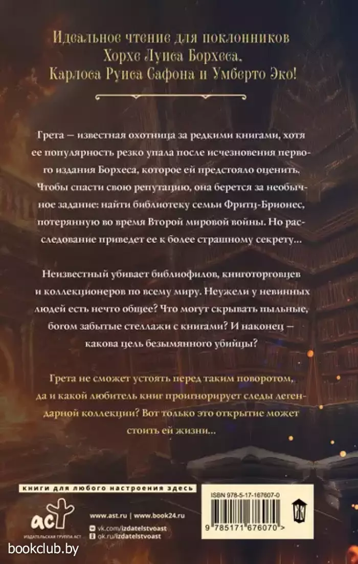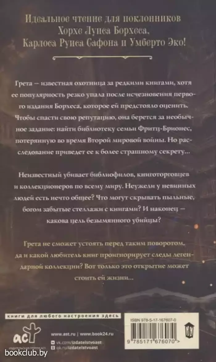 Идеальное чтение для поклонников Хорхе Луиса Борхеса, Карлоса Руиса Сафона и Умберто Эко! Грета — известная охотница за редкими книгами, хотя её популярность резко упала после исчезновения первого издания Борхеса, которое ей предстояло оценить. Чтобы спасти свою репутацию, она берётся за необычное задание: найти библиотеку семьи Фриц-Брионес, потерянную во время Второй мировой войны. Но расследование приведет ее к более страшному секрету… Неизвестный убивает библиофилов, книготорговцев и коллекционеров по всему миру. Неужели у невинных людей есть нечто общее? Что могут скрывать пыльные, богом забытые стеллажи с книгами? И наконец — в чем цель безымянного убийцы? Грета не сможет устоять перед таким поворотом, да и какой любитель книг проигнорирует следы легендарной коллекции? Вот только это открытие может стоить ей жизни…