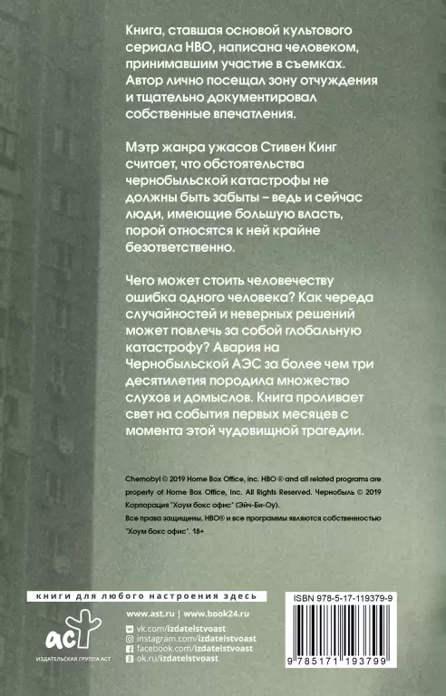 Книга легла в основу культового сериала НВО. Автор посещал зону отчуждения и документировал свои впечатления. Чего может стоить человечеству ошибка одного человека? Как череда случайностей и неверных решений может привести к глобальной катастрофе? Авария в Чернобыле породила множество слухов и домыслов. Книга проливает свет на события первых месяцев с момента этой трагедии. Обстоятельства чернобыльской катастрофы не должны быть забыты, ведь и сейчас люди, имеющие большую власть, относятся к ней крайне безответственно.