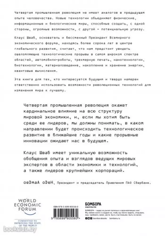 Клаус Шваб, основатель и бессменный президент Всемирного экономического форума в Давосе, написал руководство, которое призвано помочь сориентироваться в происходящих изменениях и извлечь из этого максимум выгоды. Эта книга для тех, кто интересуется нашим общим будущим и кто твердо намерен использовать возможности революционных изменений, чтобы изменить мир к лучшему. Мы стоим у истоков революции, которая фундаментально изменит то, как мы живем, работаем и общаемся друг с другом. По масштабу, объему и сложности четвертая промышленная революция не имеет аналогов во всем предыдущем опыте человечества. Нам предстоит увидеть ошеломляющие технологические прорывы в самом широком спектре областей, включая искусственный интеллект, роботизацию, автомобили-роботы, трехмерную печать, нанотехнологии, биотехнологии и многое другое. Об авторе Клаус М. Шваб - швейцарский экономист, основатель и президент Давосского форума, главной целью которого является поиск новых направлений в развитии мировой экономики, а также решение проблем социального прогресса.