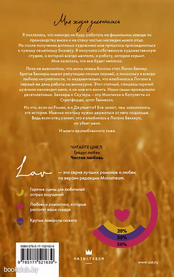 Моя жизнь закончилась. Я поклялась, что никогда не буду работать на фамильном заводе по производству виски и не стану частью наследия моего отца. Но после получения диплома художника мне пришлось присоединиться к чужому семейному бизнесу. Я получила собственную художественную студию, о которой всегда мечтала, и работу, которая кормит. Мне казалось, что все будет неплохо. Пока не выяснилось, что моим новым боссом стал Логан Беккер. Братья Беккеры имеют репутацию плохих парней, а поскольку я всегда любила неприятности, то неудивительно, что влюбилась в Логана в первый же день работы на винокурне. Этот статный, слишком горячий мужчина ненавидит меня, и не мне его винить. Наши семьи враждовали десятилетиями. Беккеры и Скутеры – это Монтекки и Капулетти из Стратфорда, штат Теннесси. Но что, если он Ромео, а я Джульетта? Все знают, чем закончилась эта история. Именно поэтому нужно держаться от него подальше. Ведь если отец узнает, что я влюбилась в Логана Беккера,он убьет меня. И моего возлюбленного тоже.