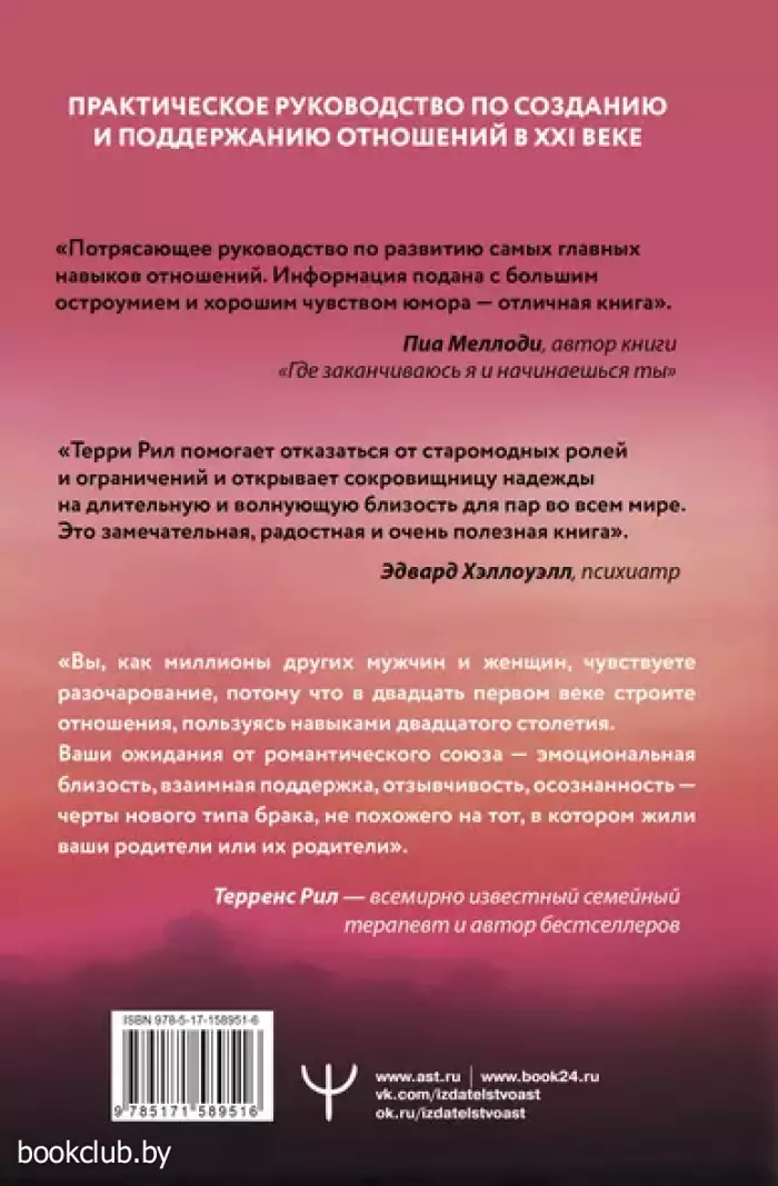 В своей новой уникальной книге Терренс Рил, выдающийся психотерапевт и автор бестселлеров, доказывает то, что необходимо услышать всем женщинам: ты не сошла с ума — ты права! За последние двадцать пять лет женщины изменились — они стали сильнее, увереннее в себе, счастливее и самостоятельнее. Однако в то же время многие мужчины так и остались безответственными и эмоционально отстраненными. Они не знают, как реагировать на разочарование их супруг, которые всего лишь хотят, чтобы их спутники проявили себя и повзрослели. Хорошие новости: в этой революционной книге Рил формулирует новые правила брака XXI века, предлагая женщинам набор эффективных инструментов, с помощью которых они смогут создать по-настоящему близкие отношения, которых хотят и заслуживают. Автор выделяет пять типов мужчин, которых следует избегать, и делится практическими стратегиями, которые вернут честность, страсть и радость даже в самые сложные отношения. Используя свой опыт помощи тысячам пар, Рил покажет, как перейти от отчаяния к глубокой эмоциональной близости, и проведет вас через процесс восстановления отношений с помощью упражнений, которые вы можете выполнять как в одиночку, так и вместе с партнером. Из этой книги вы узнаете, как: