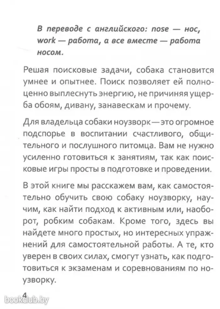 Предложенные в книге упражнения позволяют домашним собакам заниматься любимым делом, да ещё и в компании с хозяином. А это не только делает жизнь питомцев насыщеннее и интереснее, но и «подтягивает» их послушание, улучшая отношения в тандеме владелец-собака. Выполнять упражнения могут все собаки без исключения, никаких ограничений по возрасту, здоровью, породе или темпераменту.