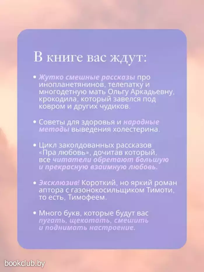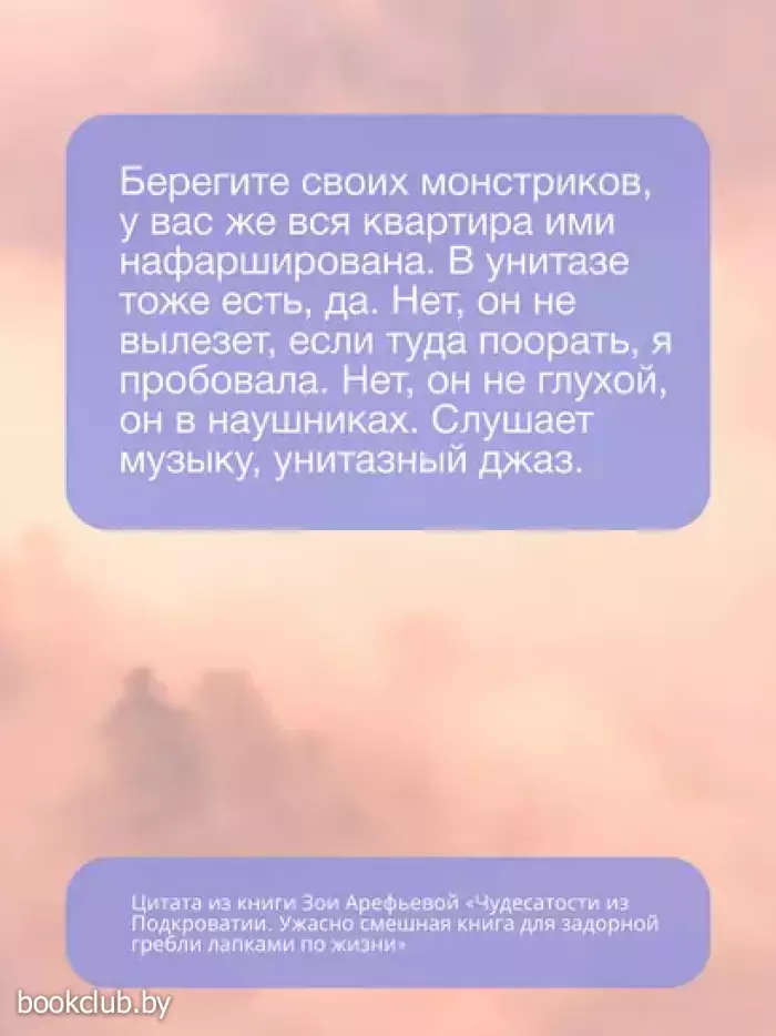 Лифт в детство отправляется через 3, 2, 1… Скорее открывай эту книгу, чтобы успеть! Она будет и пугать, и смешить, и щекотать буковками. В чудесном мире Подкроватии ты познакомишься с домашними и дикими пугачками, с семьей волшебников, женщинами-телепатками и другими чудиками, и отдохнешь по полной!