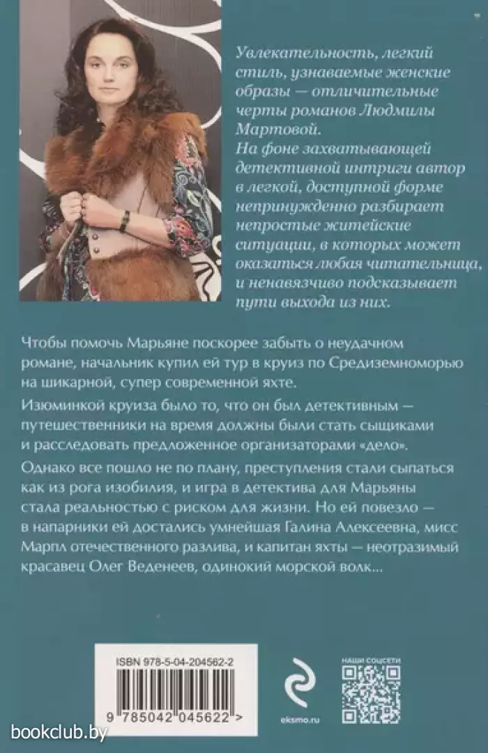 Чтобы поскорее забыть о неудачном романе, Марьяна отправилась в тур по Средиземноморью на шикарной суперсовременной яхте. На борту она узнала, что круиз будет особенный — путешественники должны представить себя сыщиками и расследовать предложенное организаторами дело. Однако все пошло не по плану: преступления стали происходить одно за другим, и придуманный детектив обернулся для туристов самым что ни на есть реальным! Но Марьяне повезло — в напарники ей достался капитан яхты, неотразимый красавец Олег Веденеев, одинокий морской волк...