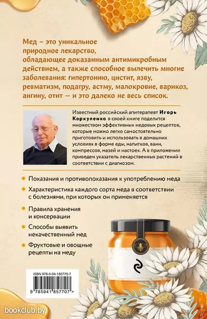 Автор книги — Игорь Коркуленко, д.м.н., известный российский специалист по лечению продуктами пчеловодства. На страницах издания вы найдете показания и противопоказания к употреблению меда, характеристики разных сортов меда, фруктовые и овощные рецепты на меду, а также рецепты с использованием разных продуктов пчеловодства, таких как маточное молочко, прополис. Вы узнаете, как использовать мед для лечения и профилактики заболеваний сердечно-сосудистой системы, органов дыхания, ЖКТ и при других нарушениях в работе организма. В конце книги имеется короткое приложение со списком лекарственных растений по диагнозу и воздействию.