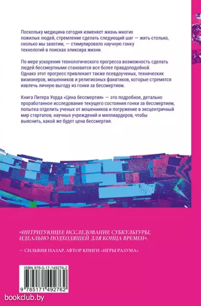 Книга Питера Уорда «Цена бессмертия» — это подробное, детально проработанное исследование текущего состояния гонки за бессмертием, попытка отделить ученых от мошенников и погружение в эксцентричный мир стартапов, научных учреждений и миллиардеров, чтобы выяснить, какова же будет цена бессмертия.