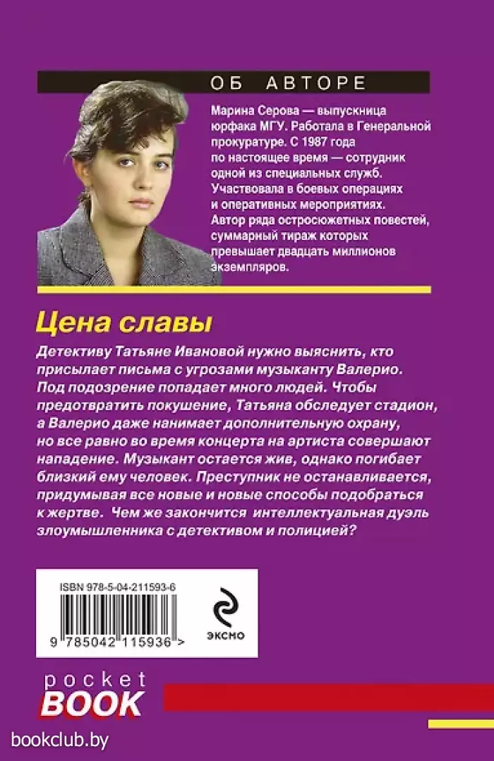 Марина Серова — феномен современного отечественного детективного жанра. Выпускница юрфака МГУ, работала в Генеральной прокуратуре. Участвовала в оперативных мероприятиях. Автор ряда остросюжетных повестей, суммарный тираж которых превышает двадцать миллионов экземпляров.