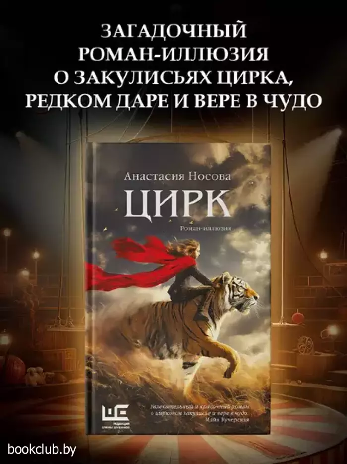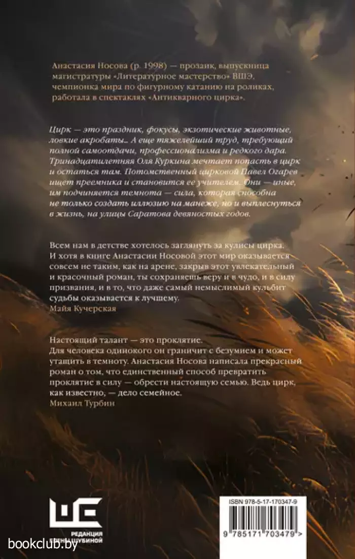 Анастасия Носова (р. 1998) — прозаик, выпускница магистратуры «Литературное мастерство» ВШЭ, чемпионка мира по фигурному катанию на роликах, работала в спектаклях «Антикварного цирка». Цирк — это праздник, фокусы, экзотические животные, ловкие акробаты… А еще тяжелейший труд, требующий полной самоотдачи, профессионализма и редкого дара. Тринадцатилетняя Оля Куркина мечтает попасть в цирк и остаться там. Потомственный цирковой Павел Огарев ищет преемника и становится ее учителем. Они — иные, им подчиняется темнота — сила, которая способна не только создать иллюзию на манеже, но и выплеснуться в жизнь — на улицы Саратова девяностых годов. "Всем нам в детстве хотелось заглянуть за кулисы цирка. И хотя в книге Анастасии Носовой этот мир оказывается совсем не таким, как на арене, закрыв этот увлекательный и красочный роман, ты сохраняешь веру и в чудо, и в силу призвания, и в то, что даже самый немыслимый кульбит судьбы оказывается к лучшему". Майя Кучерская "Настоящий талант – это проклятие. Для человека одинокого он граничит с безумием и может утащить в темноту. Анастасия Носова написала прекрасный роман о том, что единственный способ превратить проклятие в силу — обрести настоящую семью. Ведь цирк, как известно, — дело семейное". Михаил Турбин