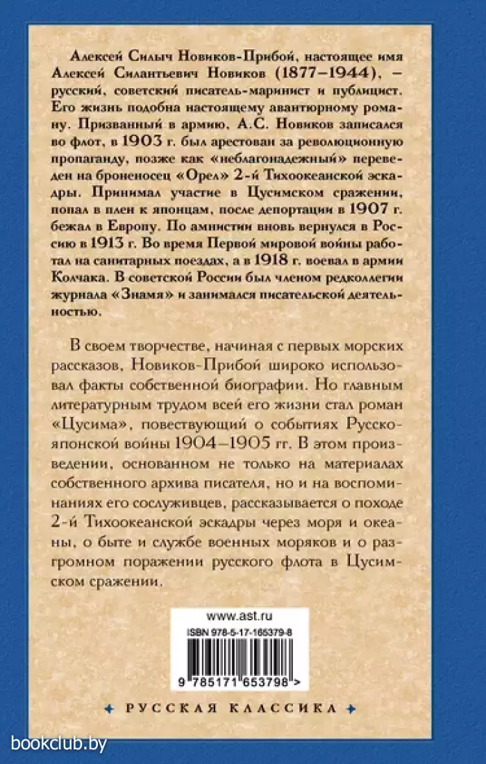 Алексей Силыч Новиков-Прибой, настоящее имя Алексей Силантьевич Новиков (1877-1944) – русский, советский писатель-маринист и публицист. Его жизнь подобна настоящему авантюрному роману. Призванный в армию, А.С. Новиков, записался во флот, в 1903 г. был арестован за революционную пропаганду, позже как "неблагонадежный" переведен на броненосец "Орел" 2-й Тихоокеанской эскадры. Принимал участие в Цусимском сражении, попал в плен к японцам, после депортации, в 1907 г. бежал в Европу. По амнистии вновь вернулся в Россию в 1913 г. Во время Первой мировой войны работал на санитарных поездах, а в 1918 г. воевал в армии Колчака. В советской России был членом редколлегии журнала "Знамя" и занимался писательской деятельностью. В своем творчестве, начиная с первых морских рассказов, Новиков-Прибой широко использовал факты собственной биографии. Но главным литературным трудом всей его жизни стал роман "Цусима", повествующий о событиях Русско-японской войны 1904-1905 гг. В этом произведении, основанном на материалах не только собственного архива писателя, но и на воспоминаниях его сослуживцев, рассказывается о походе 2-й Тихоокеанской эскадры через моря и океаны, о быте и службе военных моряков и о разгромном поражении русского флота в Цусимском сражении.