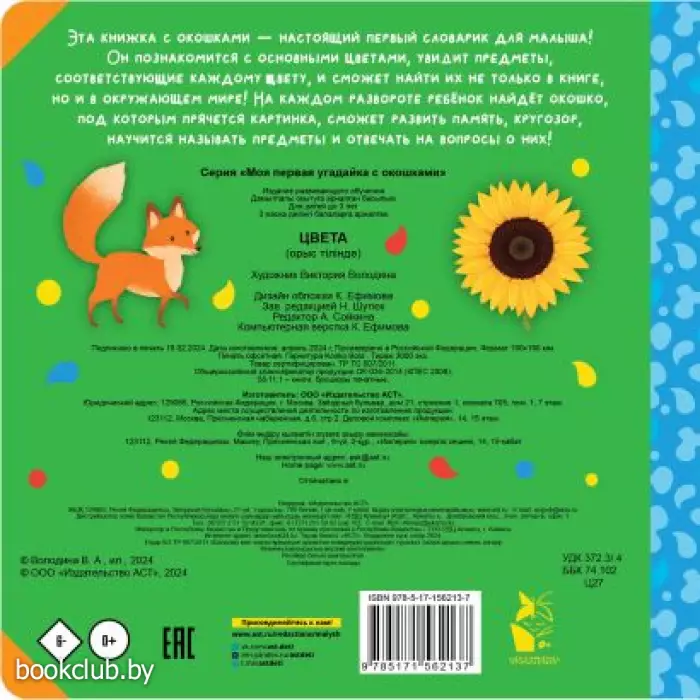 Эта книжка с окошками – настоящий первый словарик для малыша! Он познакомится с основными цветами, увидит предметы, соответствующие каждому цвету, и сможет найти их не только в книге, но и в окружающем мире! На каждом развороте ребёнок найдёт окошко, под которым прячется картинка, сможет развить память, кругозор, научится называть предметы и отвечать на вопросы о них!