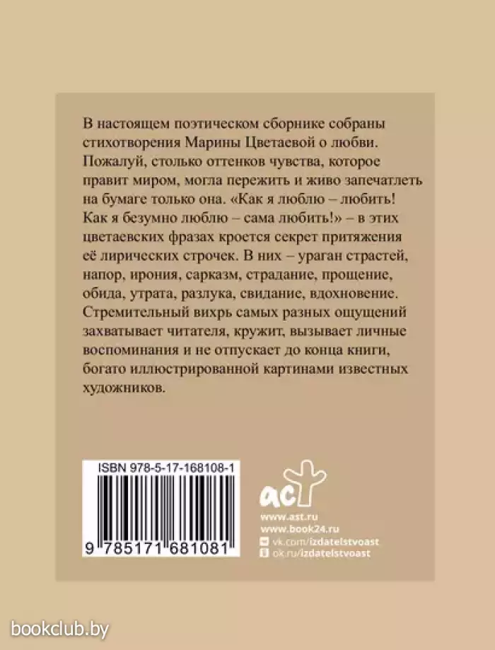 В настоящем поэтическом сборнике собраны стихотворения Марины Цветаевой о любви. Пожалуй, столько оттенков чувства, которое правит миром, могла пережить и ярко запечатлеть на бумаге только она. "Как я люблю — любить! Как я безумно люблю — сама любить!" — в этих цветаевских фразах кроется секрет притяжения ее лирических строчек. В них — ураган страстей, напор, ирония, сарказм, страдание, прощение, обида, утрата, разлука, свидание, вдохновение. Стремительный вихрь самых разных ощущений захватывает читателя, кружит, вызывает личные воспоминания и не отпускает до конца книги, богато иллюстрированной картинами известных художников.