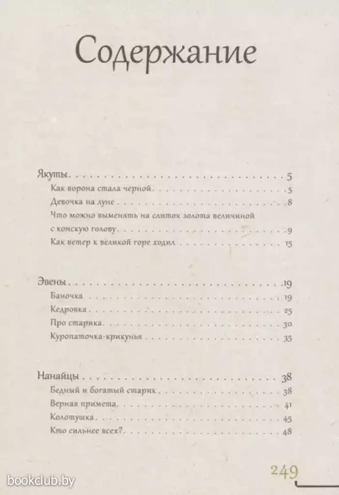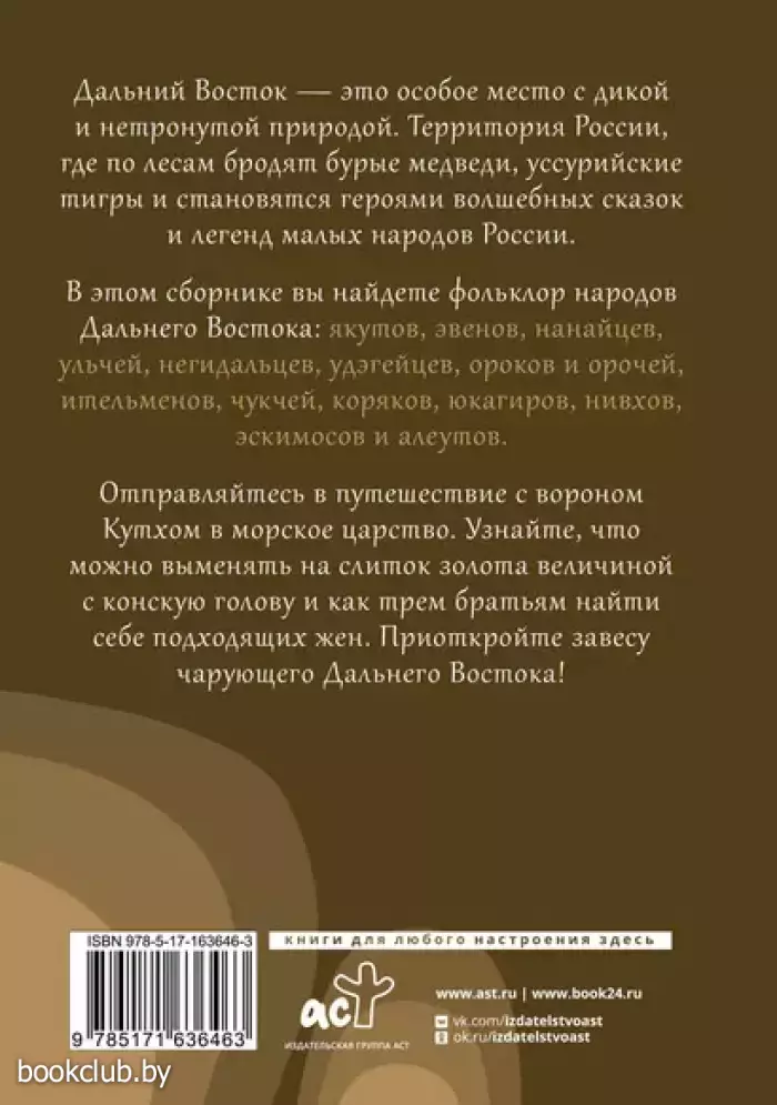 Дальний Восток — это особое место с дикой и нетронутой природой. Территория России, где по лесам бродят бурые медведи, уссурийские тигры и становятся героями волшебных сказок и легенд малых народов России. В этом сборнике вы найдете фольклор народов Дальнего Востока: якутов, эвенов, нанайцев, ульчей, негидальцев, удэгейцев, ороков и орочей, ительменов, чукчей, коряков, юкагиров, нивхов, эскимосов и алеутов. Отправляйтесь в путешествие с вороном Кутхом в морское царство. Узнайте, что можно выменять на слиток золота величиной с конскую голову и как трем братьям найти себе подходящих жен. Приоткройте завесу чарующего Дальнего Востока!