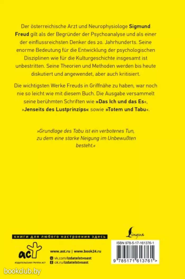 В сборник вошли самые важные и увлекательные работы Фрейда – "Тотем и Табу", "По ту сторону принципа удовольствия", "Я и Оно". В этих произведениях автор затрагивает наиболее спорные и значимые темы психоанализа – связь древних культур с морально-этическими нормами современного общества, психологию сексуальности и глубинные механизмы взаимодействия сознательного и бессознательного.