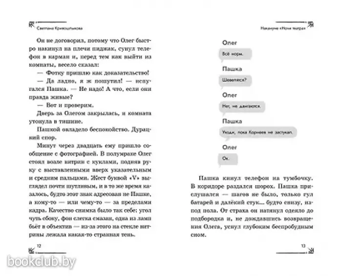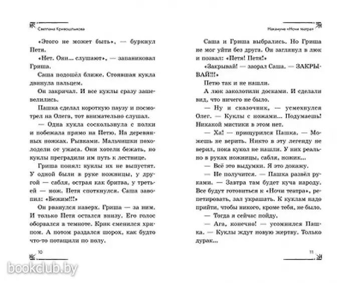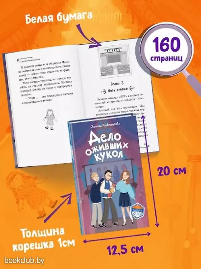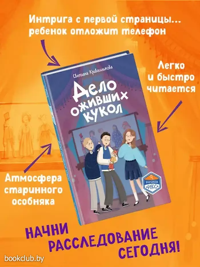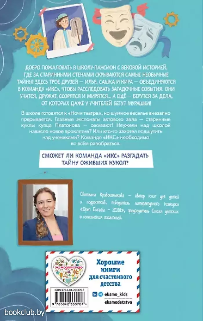 Новая детективная серия для поклонников «Чёрного котёнка» и «Мейзи Хитчинс»! Добро пожаловать в школу-пансион с вековой историей, где за старинными стенами скрываются самые необычные тайны! Светлана Кривошлыкова — автор многочисленных книг для детей и подростков, победитель литературного конкурса «Open Eurasia-2018», председатель Союза детских и юношеских писателей. Трое друзей — Илья, Кира и Сашка — объединяются в команду «ИКС», чтобы расследовать загадочные события. Они учатся, дружат, ссорятся и мирятся… а ещё — берутся за дела, от которых даже у учителей бегут мурашки! Действие историй разворачивается в уникальном месте — школе-пансионе, расположенной в бывшей купеческой усадьбе девятнадцатого века. Светлана Кривошлыкова мастерски описала загадочную атмосферу старинного здания и тайны, хранящиеся в нём. Соединение духа закрытого пансиона с современной жизнью обычных школьников делает чтение увлекательным, а раскрытие тайн — запоминающимся. В школе готовятся к «Ночи театра», но шумное веселье внезапно прерывается. Главные экспонаты актового зала — старинные куклы купца Платонова — оживают! Неужели над школой нависло новое проклятие? Или кто-то захотел подшутить над учениками? Команде «ИКС» необходимо во всём разобраться. Сможет ли команда «ИКС» разгадать тайну оживших кукол? История внутри каждой книги закончена: одна книга — одна загадка. Книги серии можно читать как отдельно друг от друга, так и вместе. Книги рассчитаны на детей от 8 лет и старше. Подойдут для внеклассного чтения. Ребёнок не устанет читать: в книгах крупный шрифт, белая бумага, запоминающееся оформление. Книга от издательства «ЭКСМО», входящая в серию «Команда "ИКС". Детский детектив», принесет массу положительных впечатлений от прочтения и займет достойное место в вашей библиотеке. Для вашего удобства при оформлении заказа по телефону назовите код товара: 417033