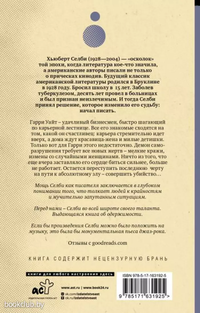 Гарри Уайт – удачливый бизнесмен, быстро шагающий по карьерной лестнице. Все его знакомые сходятся на том, какой он счастливец: карьера стремительно идет вверх, а дома ждут красавица-жена и милые детишки. Только вот для Гарри этого недостаточно. Демон саморазрушения требует все новых жертв – мелкие кражи, измены со случайными женщинами. Ничто из того, что еще вчера заставляло его сердце биться сильнее, больше не работает. Остается переступить последнюю черту на пути к абсолютному злу – совершить убийство... Книги издательства «АСТ» из серии «От битника до Паланика» - отличное приобретение для вас и ваших близких. Для вашего удобства при оформлении заказа по телефону назовите код товара: 400664