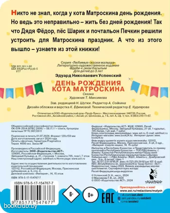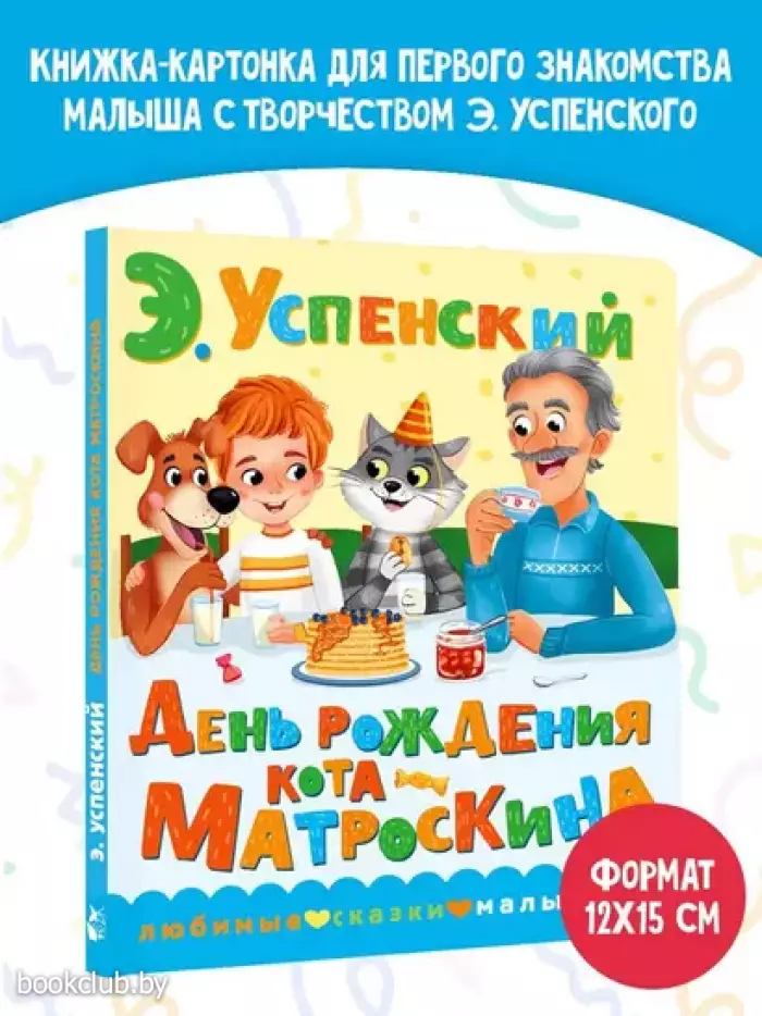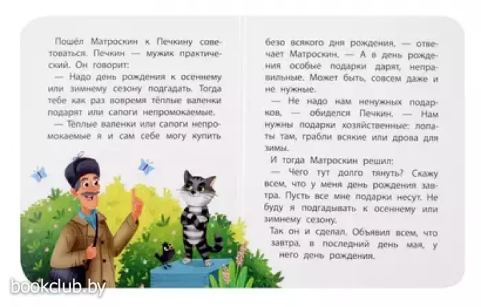 Никто не знал, когда у кота Матроскина день рождения. Но ведь это неправильно – жить без дней рождения! Так что Дядя Фёдор, пёс Шарик и почтальон Печкин решили устроить для Матроскина праздник. А что из этого вышло – узнаете из этой книжки!