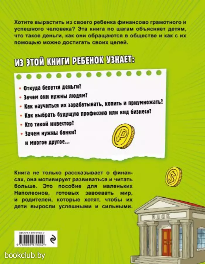 В книге простым языком рассказывается история возникновения денег, о торговле в древности, что такое банк и каково его устройство, а также, какие преимущества дают деньги и почему их стоит копить. Эта книга способна воодушевить ребенка, заинтересовать его в учебе и чтении. Ощутимо помочь в воспитании целеустремленного и успешного человека.