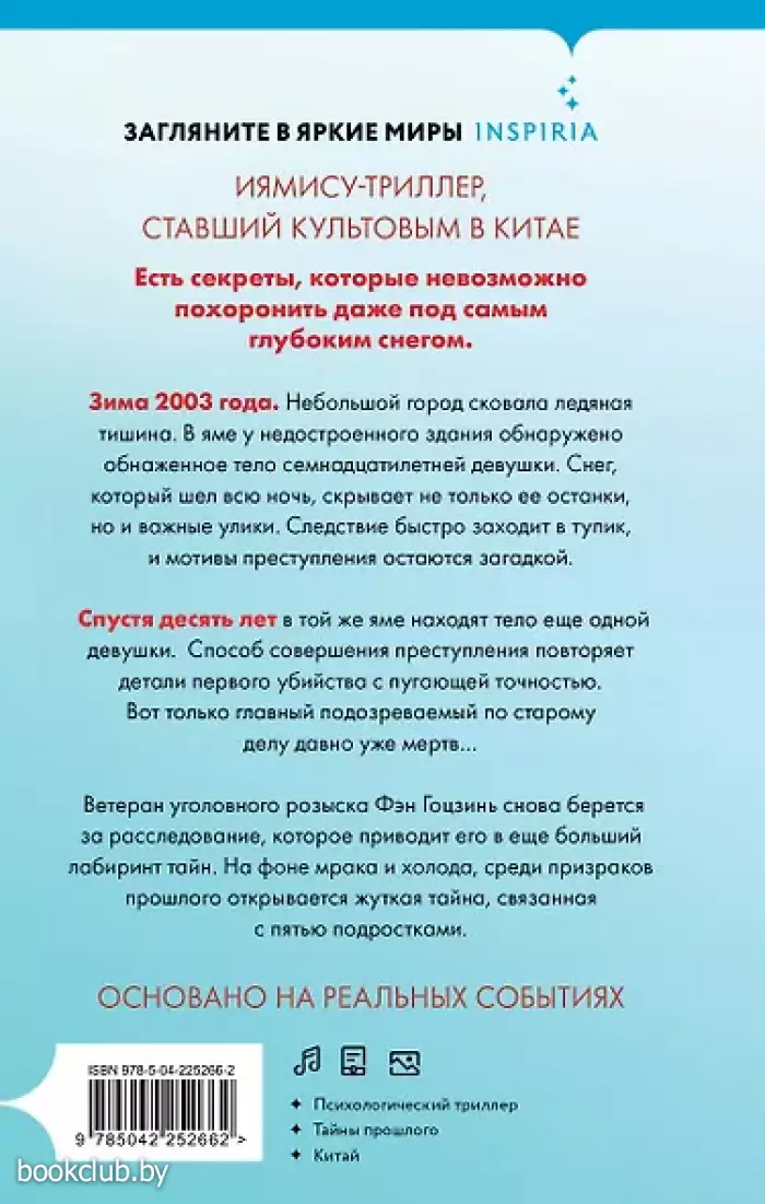 ТРИЛЛЕР, СТАВШИЙ КУЛЬТОВЫМ В КИТАЕ. Зима 2003 года. Небольшой город сковала ледяная тишина. В яме у недостроенного здания обнаружено обнаженное тело семнадцатилетней девушки. Снег, который шел всю ночь, скрывает не только ее останки, но и важные улики. Следствие быстро заходит в тупик, и мотивы преступления остаются загадкой. Спустя десять лет в той же яме находят тело еще одной девушки. Способ совершения преступления повторяет детали первого убийства с пугающей точностью. Вот только главный подозреваемый по старому делу давно уже мертв… Ветеран уголовного розыска Фэн Гоцзин снова берется за расследование, которое приводит его в еще больший лабиринт тайн. На фоне мрака и холода, среди призраков прошлого, открывается жуткая тайна, связанная с пятью подростками. ОСНОВАНО НА РЕАЛЬНЫХ СОБЫТИЯХ. «Это не просто триллер, это произведение, которое исследует внутренние конфликты героев и социальные проблемы. Оно держит читателя в напряжении до последней страницы». — PEOPLE'S DAILY ONLINE «Роман выделяется среди других произведений в жанре благодаря глубокому психологизму и умению автора рассказывать истории, которые захватывают эмоционально и интеллектуально». — THE PAPER Книги издательства «ЭКСМО» из серии «Tok. Иямису-триллер о профайлерах и маньяках» станут прекрасным дополнением вашей библиотеки. Для вашего удобства при оформлении заказа по телефону назовите код товара: 416977
