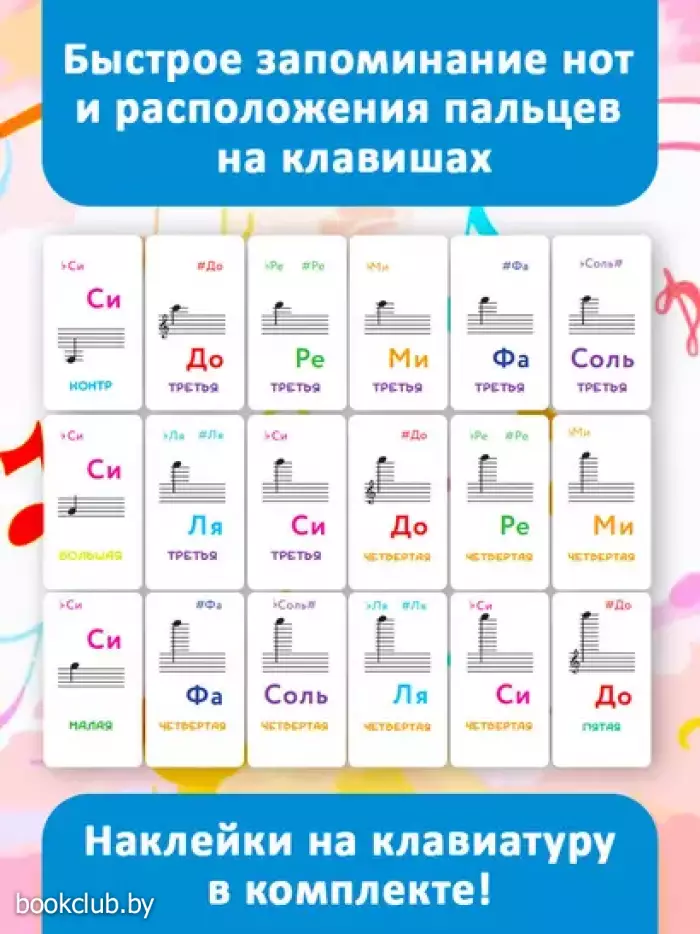 • Яркий набор наклеек для клавиш фортепиано с подписанными нотами. Ребёнок сможет наклеивать их на свой инструмент по мере изучения теоретической части самоучителя и быстрее запоминать ноты и расположение пальцев на клавишах.