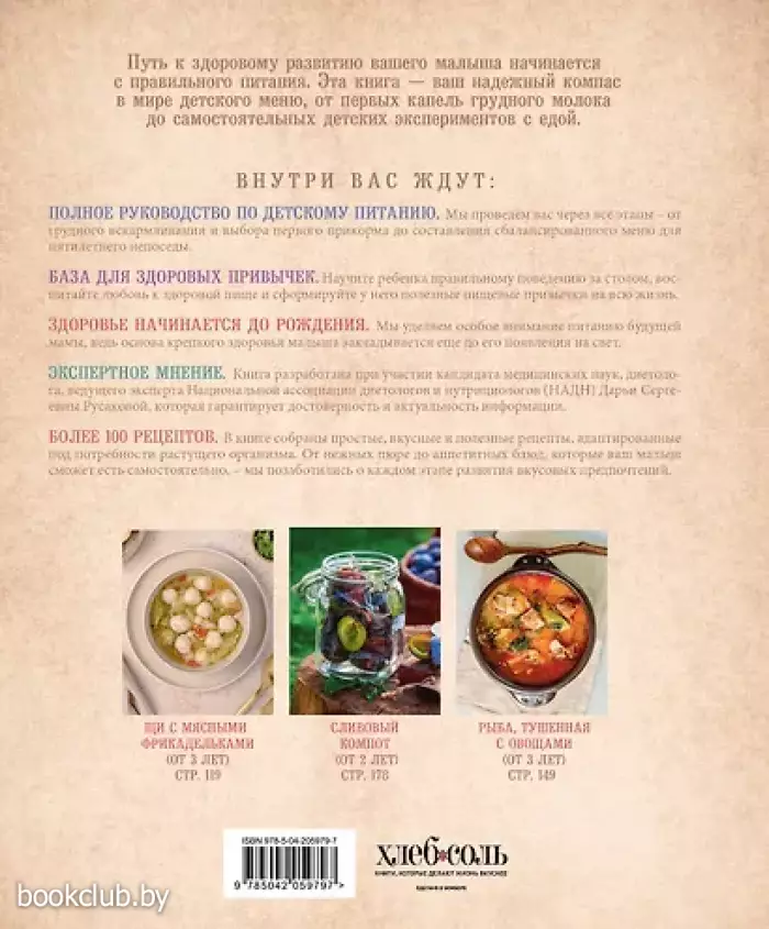Эта книга — незаменимый помощник для родителей, желающих обеспечить своему ребёнку здоровое и сбалансированное питание с первых дней жизни и до 5 лет. От грудного вскармливания до самостоятельного выбора пищи — мы шаг за шагом пройдём все этапы, развенчаем мифы и научимся избегать распространённых ошибок. Внутри вас ждут: • Подробные рекомендации по грудному вскармливанию и введению прикорма: узнайте, как правильно планировать рацион малыша, учитывая его возраст и индивидуальные особенности. • Простые и вкусные рецепты: более 100 рецептов адаптированы для детского питания, от первого прикорма до более сложных блюд. • Раздел о питании будущей мамы. • Советы по воспитанию здоровых пищевых привычек. • Экспертная поддержка от ведущего эксперта Национальной ассоциации диетологов и нутрициологов (НАДН) Дарьи Сергеевны Русаковой. Забудьте о сомнениях и тревогах! С этой книгой вы сможете создать для своего ребёнка вкусное и полезное меню, обеспечив ему гармоничное развитие и крепкое здоровье. Книга от издательства «ЭКСМО», входящая в серию «Кулинарное открытие», принесет массу положительных впечатлений от прочтения и займет достойное место в вашей библиотеке. Для вашего удобства при оформлении заказа по телефону назовите код товара: 417054
