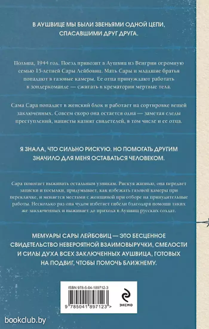 «В Аушвице мы были звеньями одной цепи, спасавшими друг друга». Польша, 1944 год. Поезд привозит в Аушвиц из Венгрии огромную семью 15-летней Сары Лейбовиц. Мать Сары и младшие братья попадают в газовые камеры. Ее отца принуждают работать в зондеркоманде — сжигать в крематории мертвые тела. Сама Сара попадает в женский блок и работает на сортировке вещей заключенных. Совсем скоро она остается одна — заметая следы преступлений, нацисты казнят свидетелей, в том числе и ее отца. После смерти отца Сара помогает выживать остальным узникам. Рискуя жизнью, она передает записки и посылки, придумывает, как избежать газовой камеры при перекличке, и меняется местами с женщиной при отборе на принудительные работы. Несколько раз она чудом избегает гибели благодаря помощи таких же заключенных и выживает до прихода в Аушвиц русских солдат. Мемуары Сары Лейбовиц — это бесценное свидетельство невероятной взаимовыручки, смелости и силе духа всех заключенных Аушвица, готовых на подвиг, чтобы помочь ближнему. Книги издательства «ЭКСМО» из серии «Жизнь в лагере смерти. Пронзительные истории выживших» - правильный выбор и отличное приобретение. Для вашего удобства при оформлении заказа по телефону назовите код товара: 416992