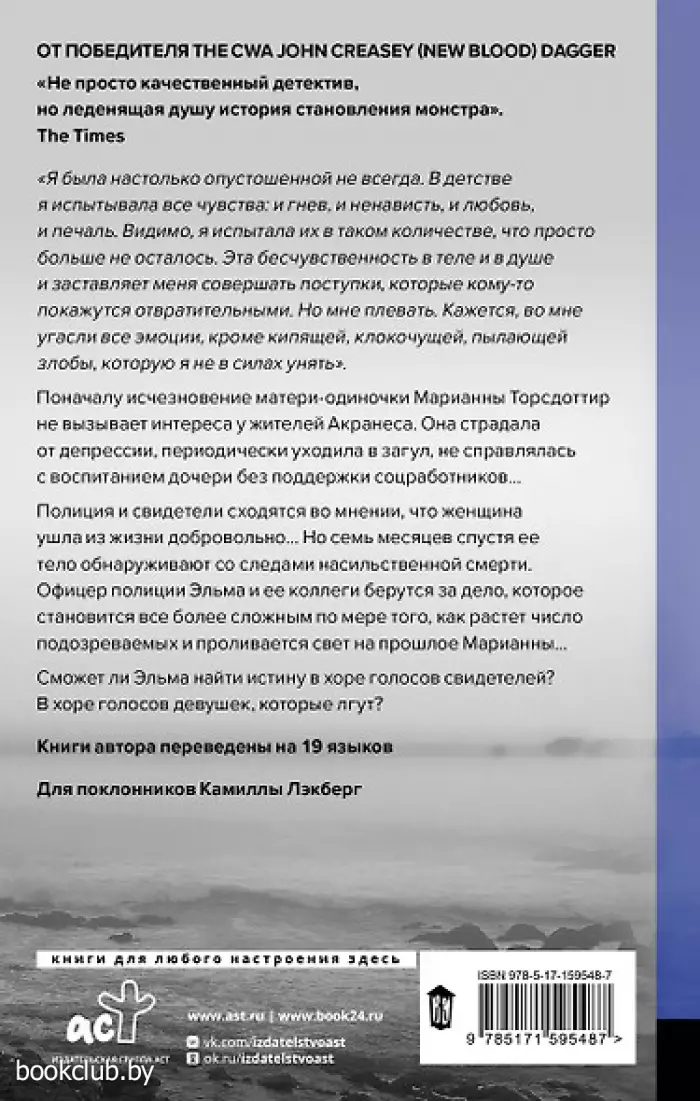«Я была настолько опустошенной не всегда. В детстве я испытывала все чувства: и гнев, и ненависть, и любовь, и печаль. Видимо, я испытала их в таком количестве, что просто больше не осталось. Эта бесчувственность в теле и в душе и заставляет меня совершать поступки, которые кому-то покажутся отвратительными. Но мне плевать. Кажется, во мне угасли все эмоции, кроме кипящей, клокочущей, пылающей злобы, которую я не в силах унять». Поначалу исчезновение матери-одиночки Марианны Торсдоттир не вызывает интереса у жителей Акранеса. Она страдала от депрессии, периодически уходила в загул, не справлялась с воспитанием дочери без поддержки соцработников... Полиция и свидетели сходятся во мнении, что женщина ушла из жизни добровольно… Но семь месяцев спустя ее тело обнаруживают со следами насильственной смерти. Офицер полиции Эльма и ее коллеги берутся за дело, которое становится все более сложным по мере того, как растет число подозреваемых и проливается свет на прошлое Марианны… Сможет ли Эльма найти истину в хоре голосов свидетелей? В хоре голосов девушек, которые лгут?