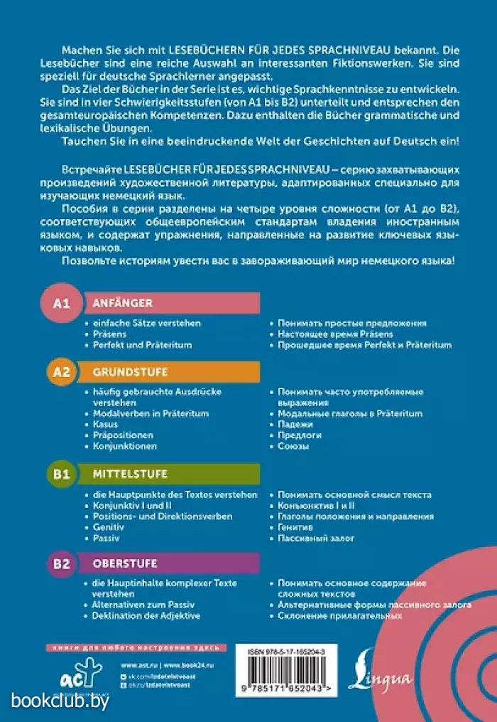 Книги издательства «АСТ» из серии «Deutsche Klassik: Lesebücher für jedes Sprachniveau» - отличное приобретение для вас и ваших близких. Для вашего удобства при оформлении заказа по телефону назовите код товара: 413693