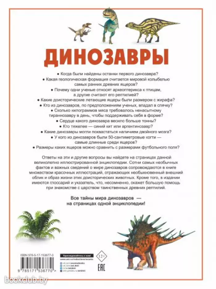 Увлекательная детская энциклопедия в картинках откроет для вас удивительный мир доисторических существ. В книге описаны различные виды динозавров, это сделано в определенном порядке: по времени и месту находки останков в пластах горных пород — геологических формациях. В издании рассказывается о пищевых пристрастиях древних рептилий, способах их охоты, защиты и нападения. Приведено большое количество важных, интересных, а порой даже неожиданных фактов. Но главное — на страницах энциклопедии содержится множество уникальных иллюстраций, которые дают читателю возможность в мельчайших подробностях рассмотреть обитателей Земли тех далеких эпох, представить их образ жизни и поведение. Книга содержит глоссарий, а также алфавитный указатель, обратившись к которому, можно легко найти сведения о заинтересовавшем динозавре. Изучать мир динозавров и других доисторических животных вместе с этой энциклопедией интересно и радостно!