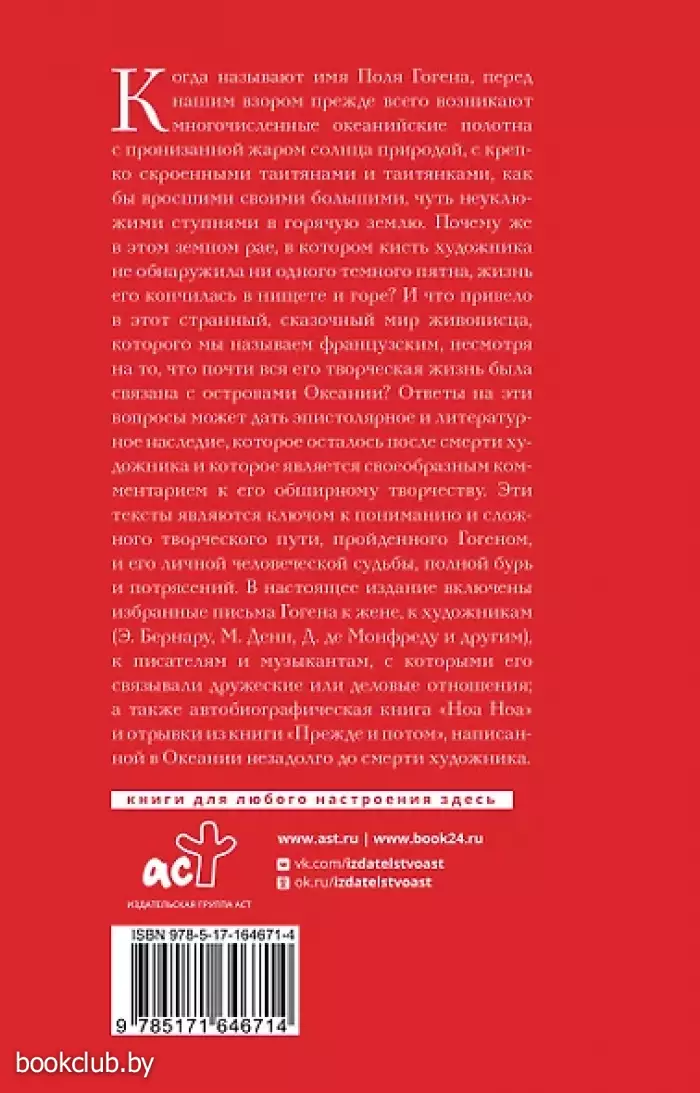Ответы на эти вопросы может дать эпистолярное и литературное наследие, которое осталось после смерти художника и которое является своеобразным комментарием к его обширному творчеству. Этитексты являются ключом к пониманию и сложного творческого пути, пройденного Гогеном, и его личной человеческой судьбы, полной бурь и потрясений. В настоящее издание включены избранные письма Гогена к жене, к художникам (Э. Бернару, М. Денн, Д. де Монфреду и другим), к писателям и музыкантам, с которыми его связывали дружеские или деловые отношения; а также автобиографическая книга "Ноа Ноа" и отрывки из книги "Прежде и потом", написанной в Океании незадолго до смерти художника.