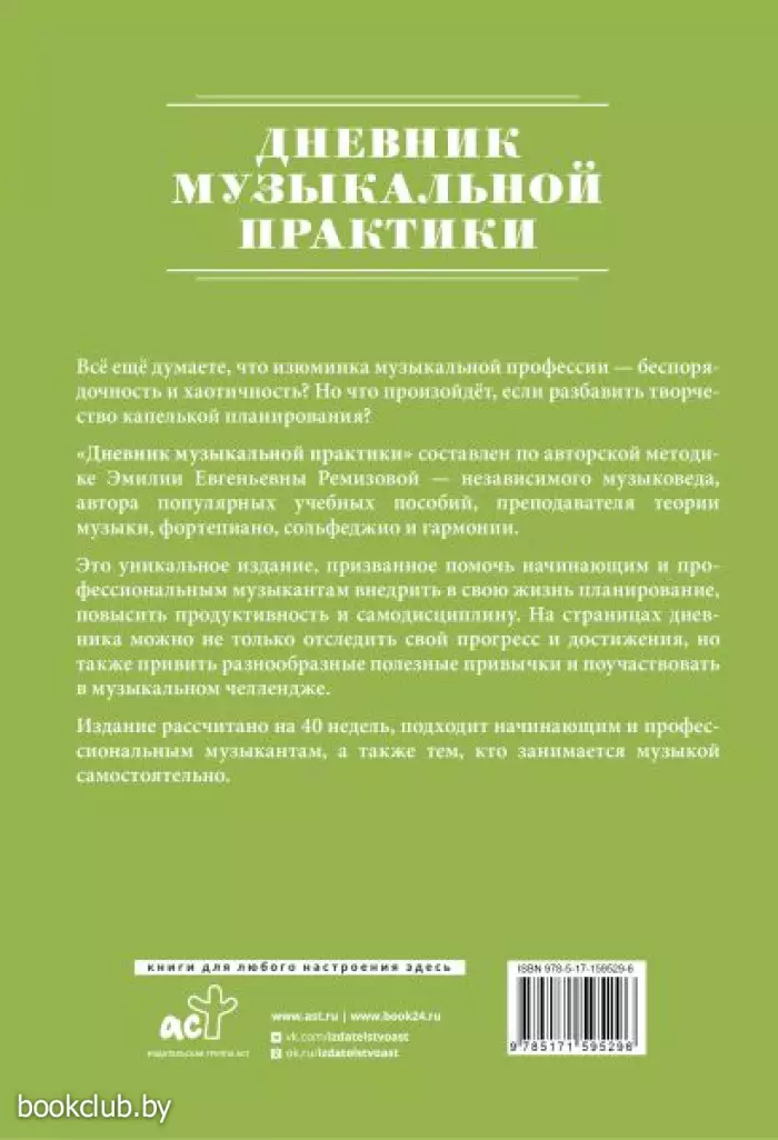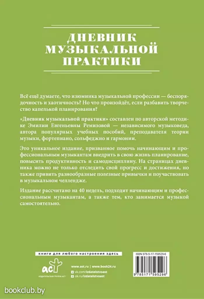 Это уникальное издание, призванное помочь начинающим и профессиональным музыкантам внедрить в свою жизнь планирование, повысить продуктивность и самодисциплину. На страницах дневника можно не только отследить свой прогресс и достижения, но также привить разнообразные полезные привычки и поучаствовать в музыкальном челлендже.