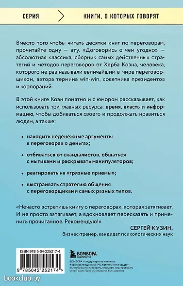 Классика литературы по переговорам от Херба Коэна, легендарного переговорщика, советника президентов и автора термина win-win. С легкостью и юмором он объясняет, как грамотно применять время, власть и информацию, чтобы добиваться желаемого и при этом сохранять хорошие отношения с людьми. Вы узнаете о самых эффективных стратегиях переговоров, которые работают всегда и везде