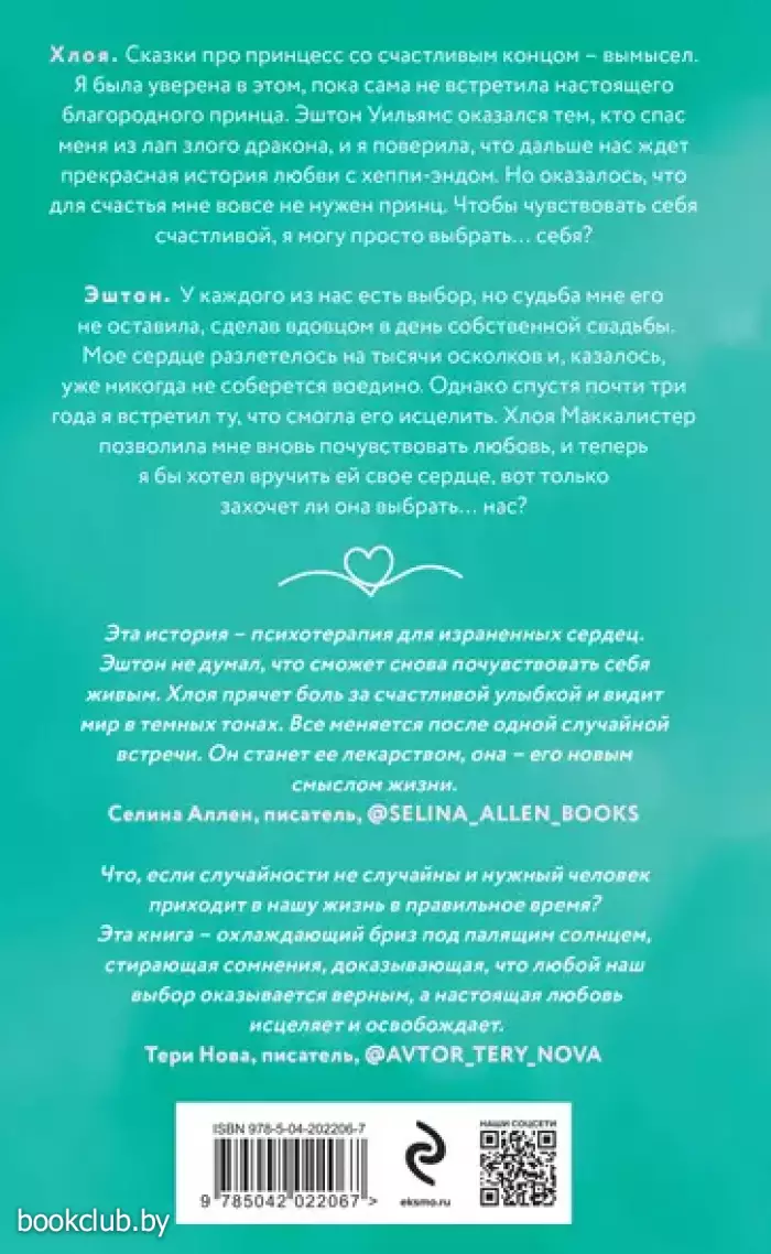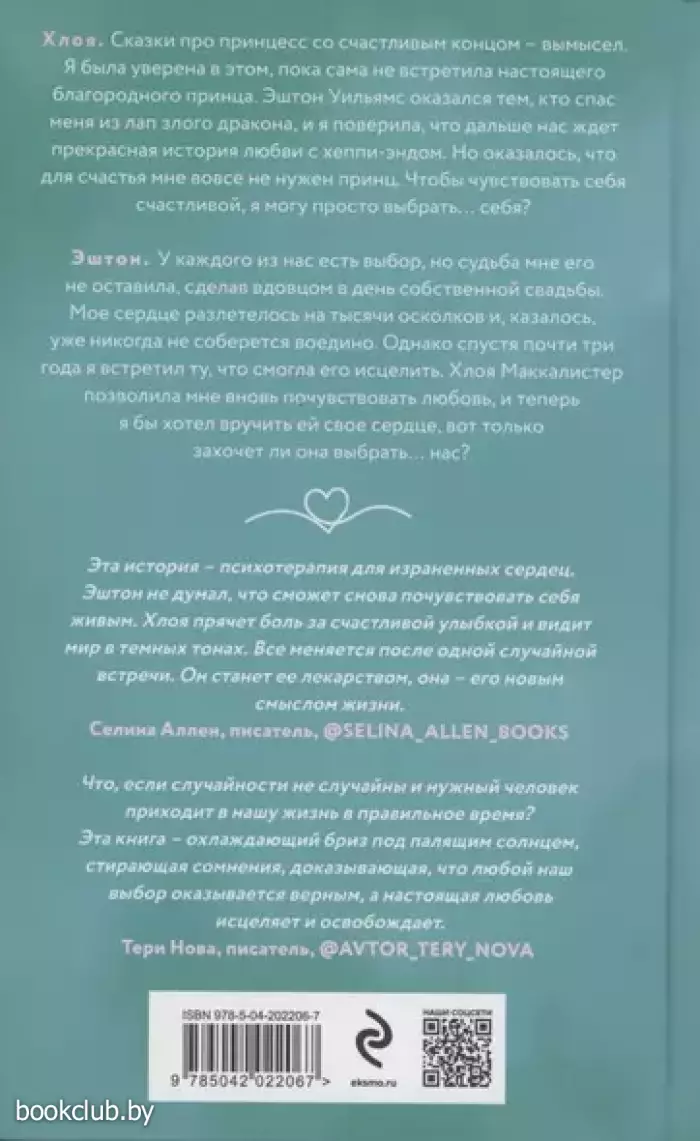 Книги Авы Хоуп — это чувственные истории о любви, в которой нет места токсичности и предательству, ее герои настолько легкие и веселые, что счастливый финал им непременно гарантирован. Хлоя. Сказки про принцесс со счастливым концом – вымысел. Я была уверена в этом, пока сама не встретила настоящего благородного принца. Эштон Уильямс оказался тем, кто спас меня из лап злого дракона, и я поверила, что дальше нас ждет прекрасная история любви с хэппи-эндом. Но оказалось, что для счастья мне вовсе не нужен принц. Чтобы чувствовать себя счастливой, я могу просто выбрать… себя? Эштон. У каждого из нас есть выбор, но судьба мне его не оставила, сделав вдовцом в день собственной свадьбы. Мое сердце разлетелось на тысячи осколков и, казалось, уже никогда не соберется воедино. Однако спустя почти три года я встретил ту, что смогла его исцелить. Хлоя Маккалистер позволила мне вновь почувствовать любовь, и теперь я бы хотел вручить ей свое сердце, вот только захочет ли она выбрать… нас?