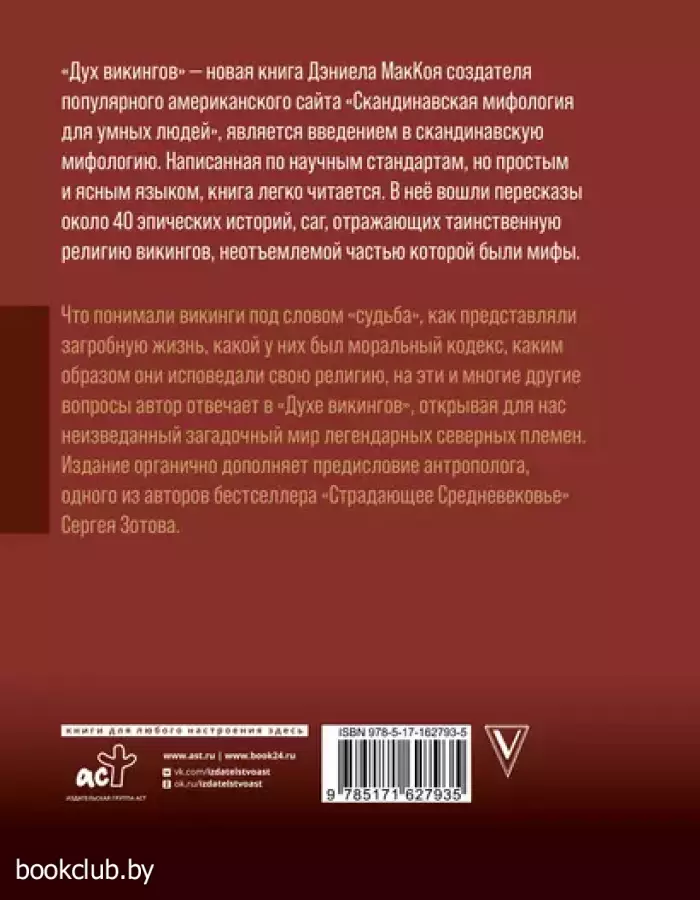 "Дух викингов" — новая книга Дэниела МакКоя, создателя популярного американского сайта "Скандинавская мифология для умных людей", является введением в скандинавскую мифологию. Написанная по научным стандартам, но простым и ясным языком, книга легко читается. В нее вошли пересказы около 40 эпических историй, саг, отражающих таинственную религию викингов, неотъемлемой частью которой были мифы.