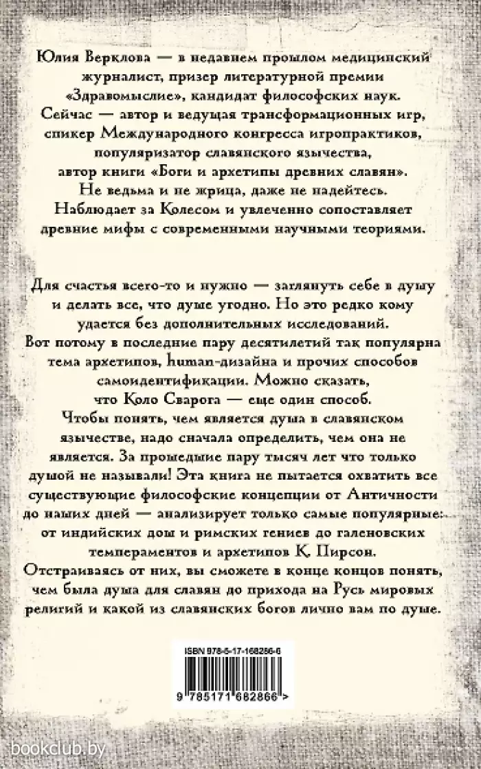 Юлия Верклова — в недавнем прошлом медицинский журналист, призер литературной премии «Здравомыслие», кандидат философских наук. Сейчас — автор и ведущая трансформационных игр, спикер Международного конгресса игропрактиков, популяризатор славянского язычества, автор книги «Боги и архетипы древних славян». Для счастья всего-то и нужно — заглянуть себе в душу и делать все, что душе угодно. Но это редко кому удается без дополнительных исследований. Вот потому в последние пару десятилетий так популярна тема архетипов, human-дизайна и прочих способов самоидентификации. Можно сказать, что Коло Сварога — еще один способ. Чтобы понять, чем является душа в славянском язычестве, надо сначала определить, чем она не является. За прошедшие пару тысяч лет что только душой не называли! Эта книга не пытается охватить все существующие философские концепции от Античности до наших дней — анализирует только самые популярные: от индийских дош и римских гениев до галеновских темпераментов и архетипов К. Пирсон. Отстраиваясь от них, вы сможете в конце концов понять, чем была душа для славян до прихода на Русь мировых религий и какой из славянских богов лично вам по душе.