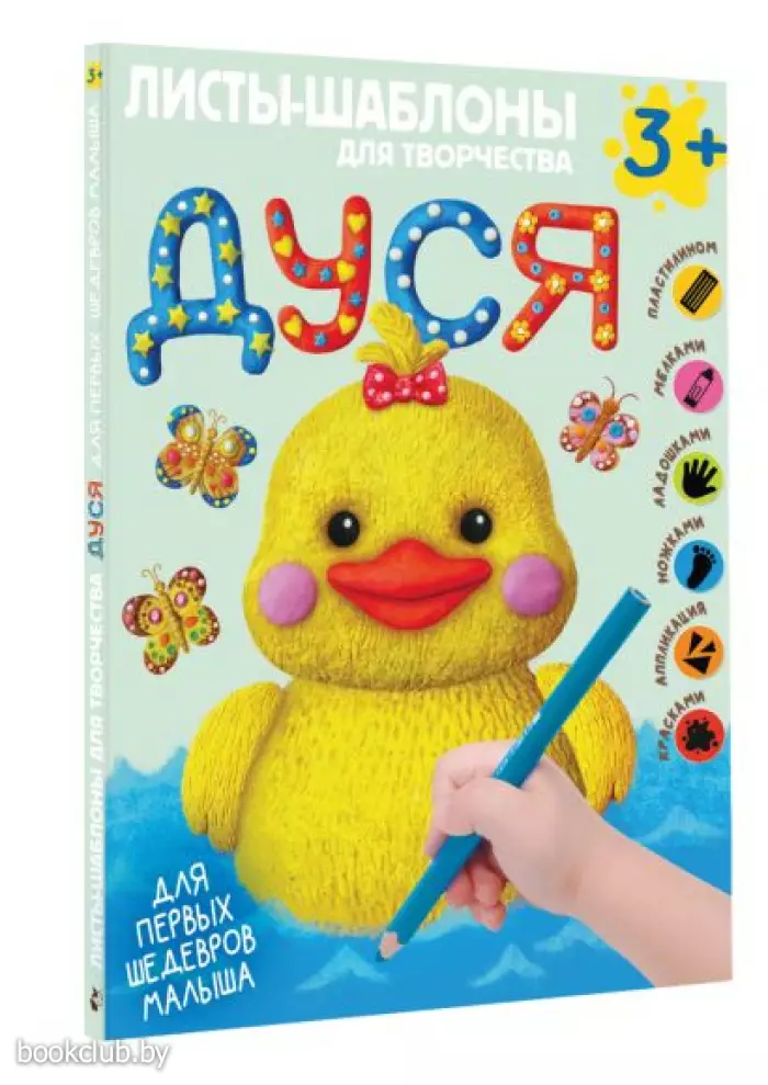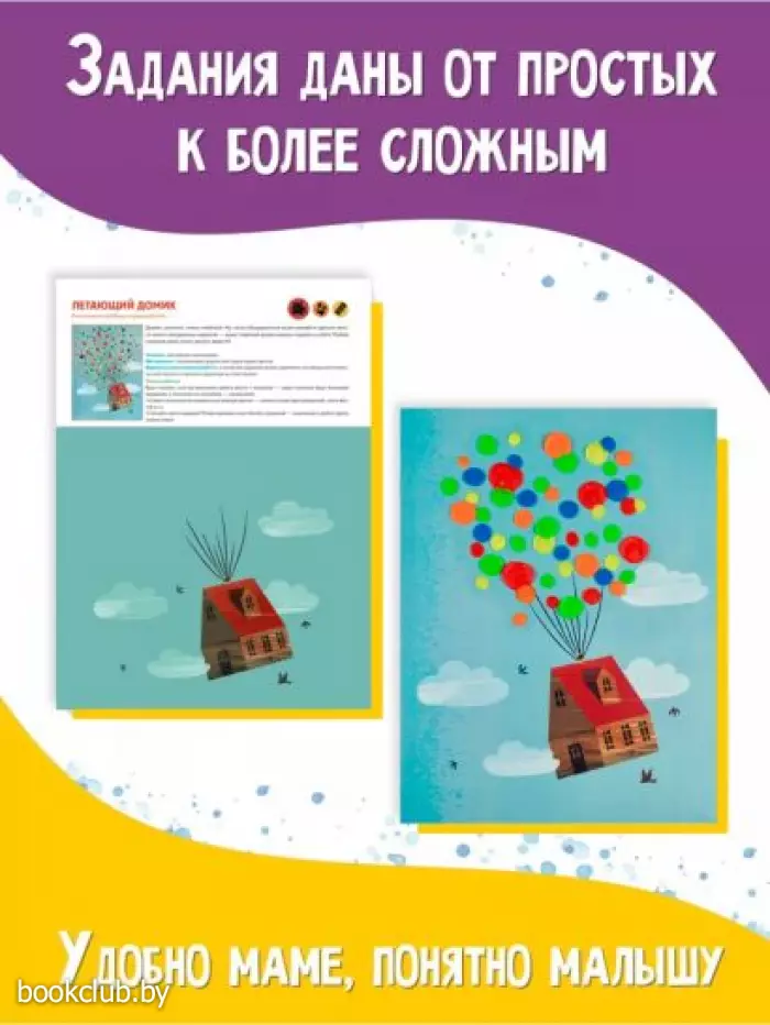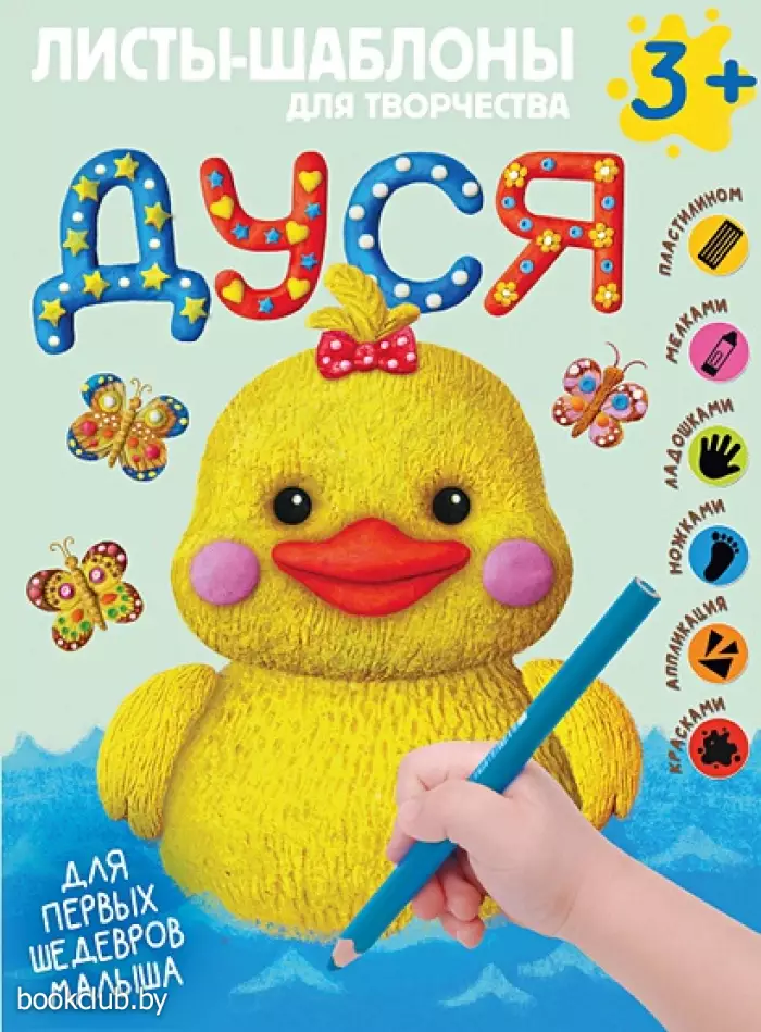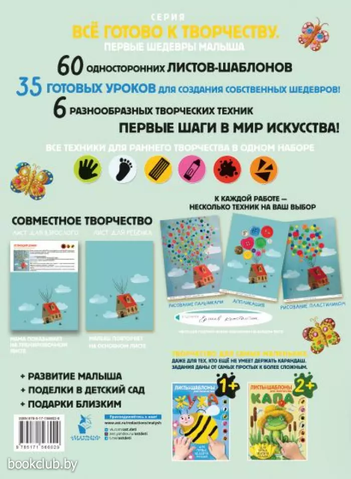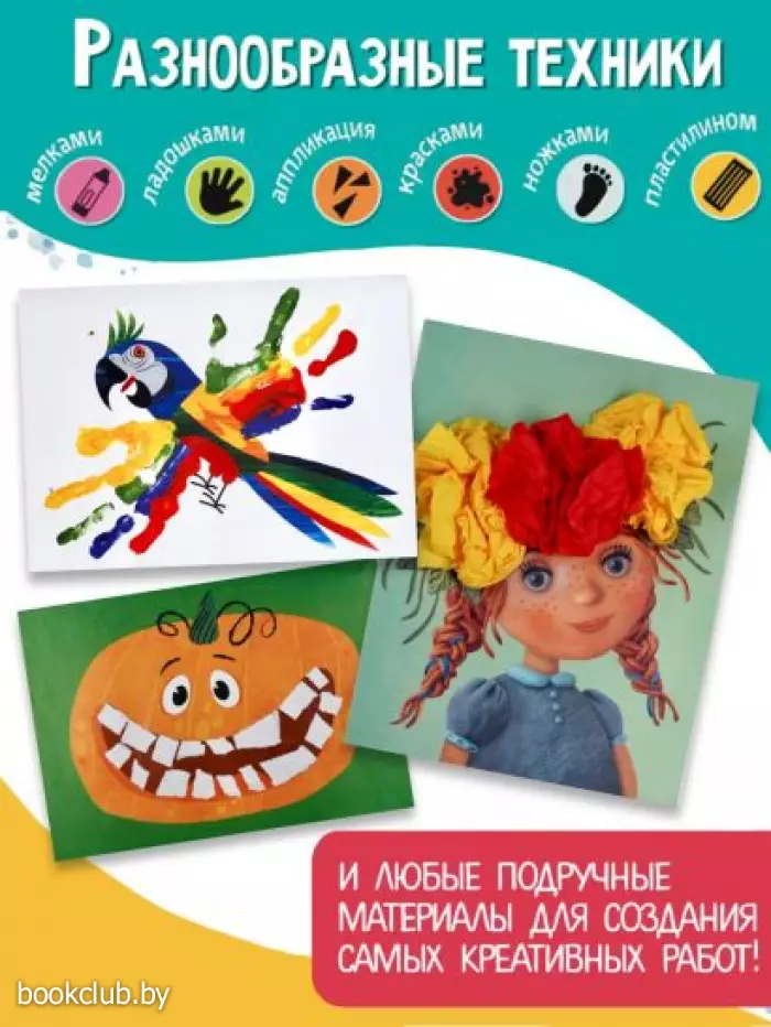- Все техники для раннего творчества в одном пособии: раскрашивание пластилином и красками, аппликация, рисование пальчиками, восковым мелком, отпечатками ручек и ножек — выберите, какая понравится вашему ребёнку больше остальных.