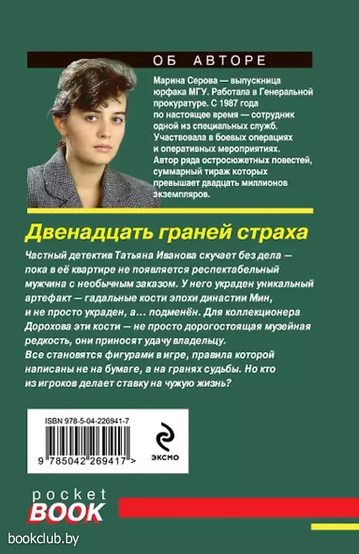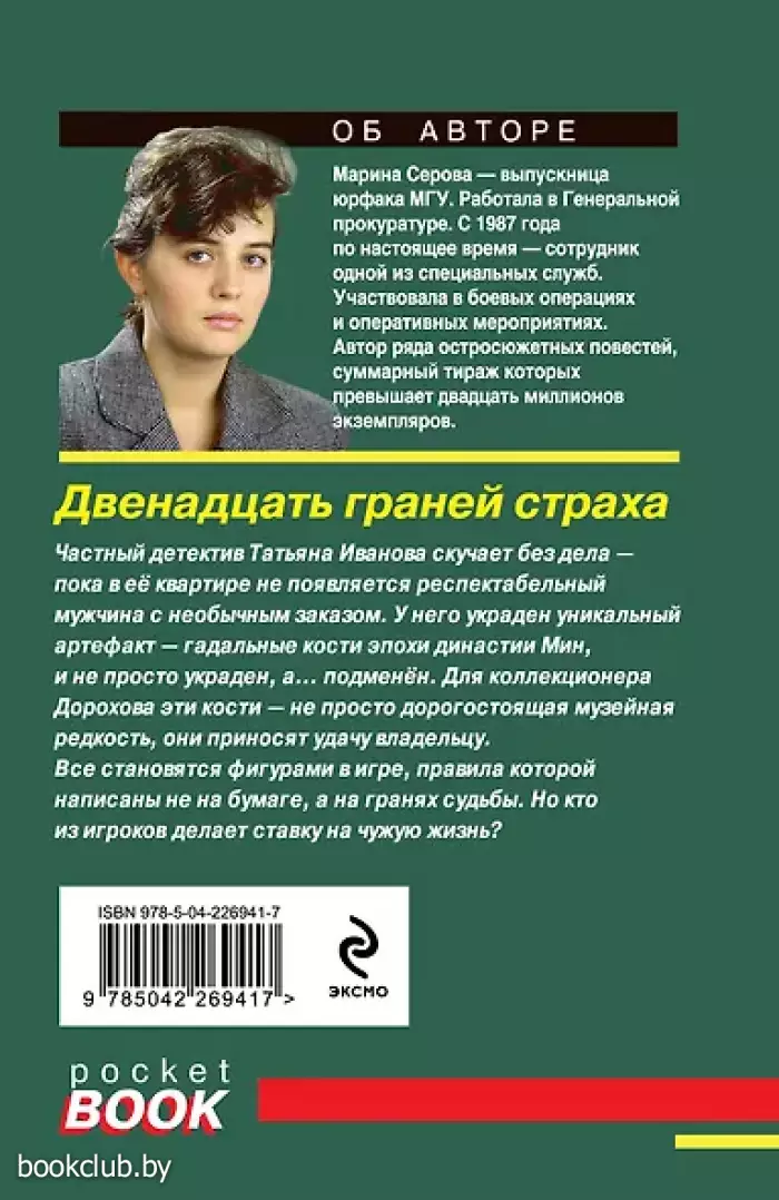 Марина Серова — феномен современного отечественного детективного жанра. Выпускница юрфака МГУ, работала в Генеральной прокуратуре. Участвовала в оперативных мероприятиях. Автор ряда остросюжетных повестей, суммарный тираж которых превышает двадцать миллионов экземпляров.