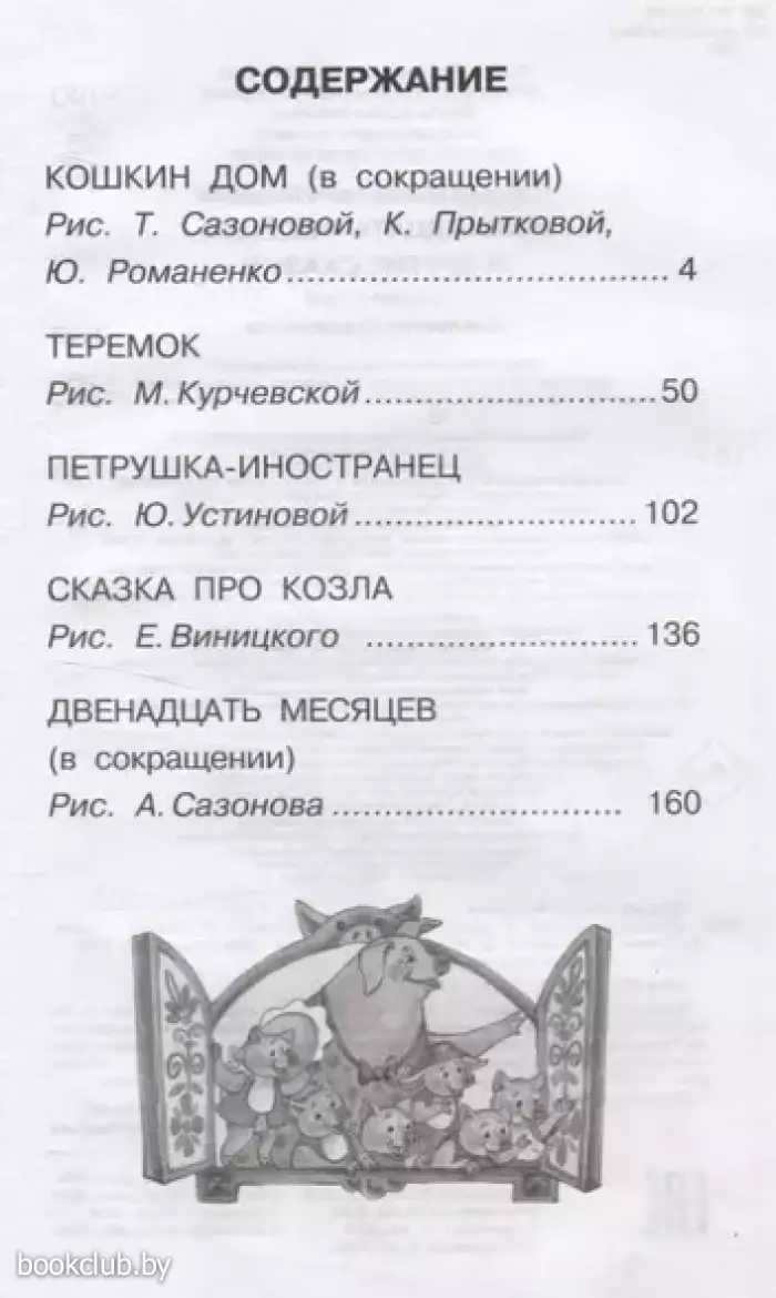 В книгу вошли сказки знаменитого поэта-классика Самуила Яковлевича Маршака. Но это не просто сказки, а сказки "для чтения и представления". Иными словами, поэт написал пьесы в стихах для детей, которые впоследствии стали классикой литературы, а также с большим успехом ставятся на сцене театров. В сборник вошли пять таких сказок-пьес — "Кошкин дом", "Теремок", "Петрушка-иностранец", "Сказка про козла" и "Двенадцать месяцев".