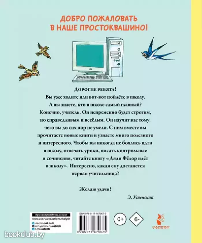 Дорогие ребята! Вы уже ходите или вот-вот пойдёте в школу. А вы знаете, кто в школе самый главный? Конечно, учитель. Он непременно будет строгим, но справедливым и весёлым. Он научит вас тому, чего вы до сих пор не умели. С ним вместе вы прочитаете новые книги и узнаете много полезного и интересного. Чтобы вы никогда не боялись идти в школу, отвечать уроки, писать контрольные и сочинения, читайте книгу «Дядя Фёдор идёт в школу». Интересно, какая ему достанется первая учительница? Желаю удачи! Э. Успенский