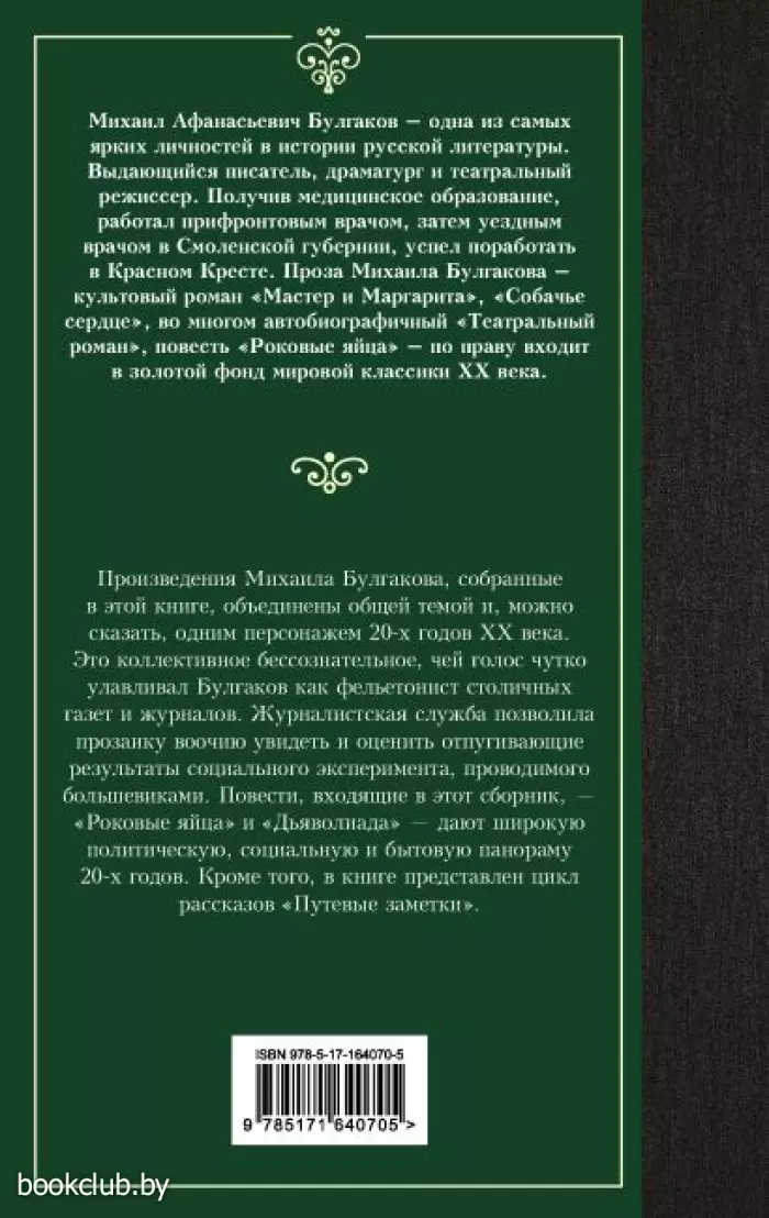Произведения Михаила Булгакова, собранные в этой книге, объединены общей темой и, можно сказать, одним персонажем 20-х годов ХХ века. Это коллективное бессознательное, чей голос чутко улавливал Булгаков как фельетонист столичных газет и журналов. Журналистская служба позволила прозаику воочию увидеть и оценить отпугивающие результаты социального эксперимента, проводимого большевиками. Повести, входящие в этот сборник, - "Роковые яйца" и "Дьяволиада" - дают широкую политическую, социальную и бытовую панораму 20-х годов.