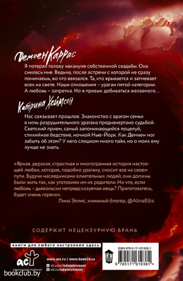 Демиен Каррас Я потерял голову накануне собственной свадьбы. Она снилась мне. Ведьма, после встречи с которой не сразу понимаешь, во что ввязался. Та, кто врывается и затмевает всех на свете. Наши отношения – ураган пятой категории. А любовь – запретна. Но я привык добиваться желаемого… Катрина Хеймсон Нас связывает прошлое. Знакомство с врагом семьи в ночь разрушительного урагана предначертано судьбой. Светский прием, самый запоминающийся поцелуй, стихийное бедствие, ночной Нью-Йорк. Как Демиен мог забыть об этом? У него слишком много тайн, но о моих ему лучше не знать.