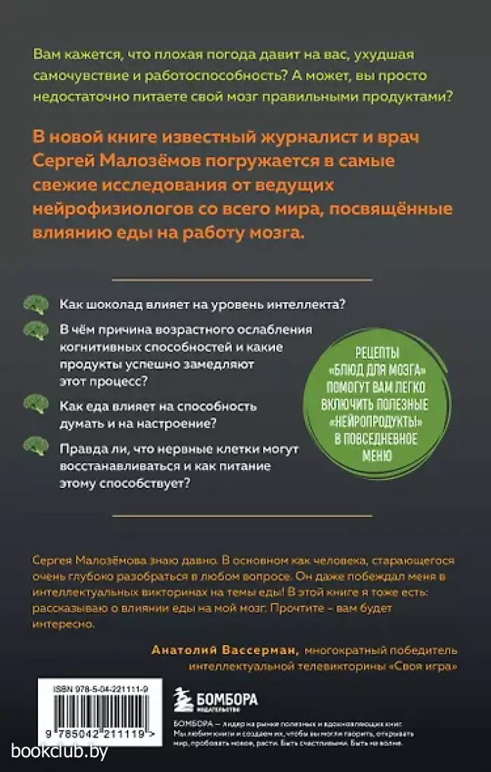 «Сергея Малозёмова знаю давно. В основном как человека, старающегося очень глубоко разобраться в любом вопросе. Он даже побеждал меня в интеллектуальных викторинах на темы еды! В этой книге я тоже есть: рассказываю о влиянии еды на мой мозг. Прочтите — вам будет интересно». — Анатолий Вассерман, многократный победитель интеллектуальной телевикторины «Своя игра»