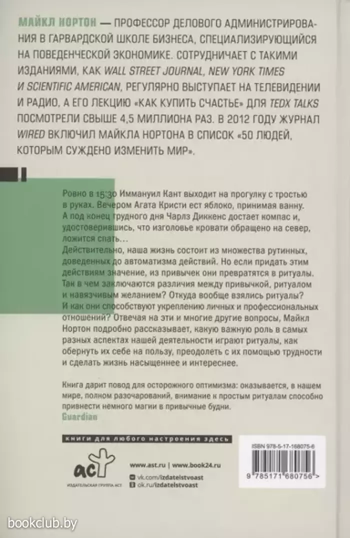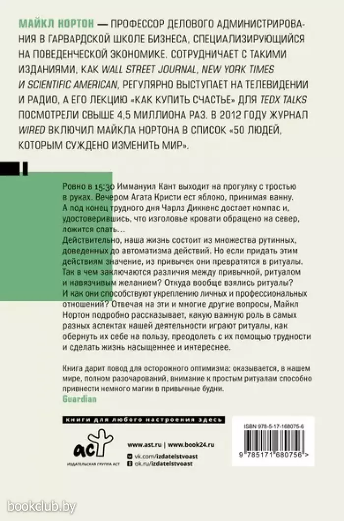 Так в чем заключаются различия между привычкой, ритуалом и навязчивым желанием? Откуда вообще взялись ритуалы? И как они способствуют укреплению личных и профессиональных отношений? Отвечая на эти и многие другие вопросы, Майкл Нортон подробно рассказывает, какую важную роль в самых разных аспектах нашей деятельности играют ритуалы, как обернуть их себе на пользу, преодолеть с их помощью трудности и сделать жизнь насыщеннее и интереснее.