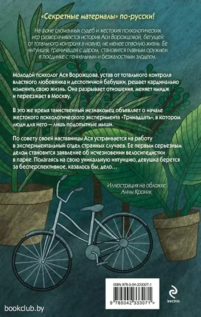 Молодой психолог Ася Ворожцова, устав от тотального контроля властного любовника и деспотичной бабушки, решает кардинально изменить свою жизнь. Она разрывает отношения, меняет имидж и переезжает в Москву. В это же время таинственный незнакомец объявляет о начале жестокого психологического эксперимента «Тринадцать», в котором люди люди для него — лишь подопытные мыши. По совету своей наставницы Ася устраивается на работу в экспериментальный отдел странных случаев. Ее первым серьезным делом становится заявление об исчезновении велосипедистки в парке. Полагаясь на свою уникальную интуицию, девушка берется за бесперспективное, казалось бы, дело… «Секретные материалы» по-русски! На фоне сломанных судеб и жестоких психологических игр разворачивается история Аси Ворожцовой, бегущей от тотального контроля в новую, но не менее опасную жизнь. Ее интуиция, граничащая с даром, становится главным оружием в поединке с гениальным и безжалостным манипулятором — Экспериментатором, который превращает человеческие жизни в свой личный научный опыт под названием «Тринадцать». Книга от издательства «ЭКСМО», входящая в серию «Отдел странных дел», принесет массу положительных впечатлений от прочтения и займет достойное место в вашей библиотеке. Для вашего удобства при оформлении заказа по телефону назовите код товара: 416973