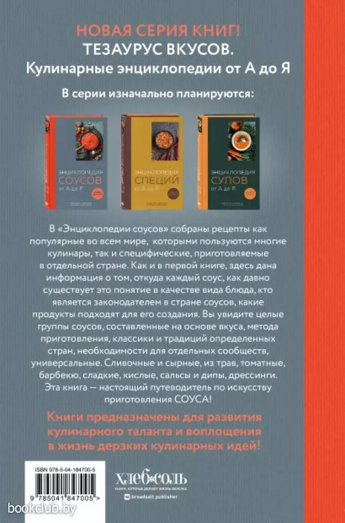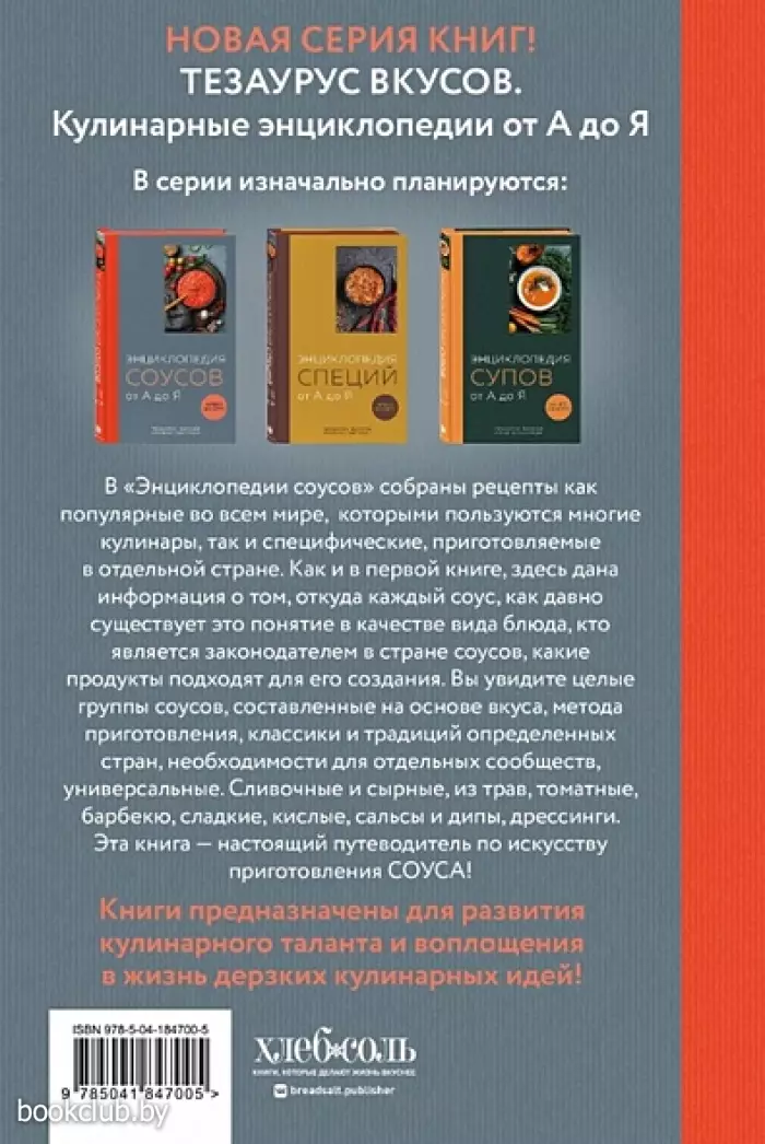 Мы знаем, что соус делает любое традиционное блюдо необычным. Мы также знаем несколько соусов, которые одобрили наши родные и друзья. Но мы по-прежнему задаемся вопросом: что же такое соус и почему он так изменяет вкус блюда в лучшую сторону? Данная книга отгадывает многие загадки, касающиеся этой тайны! Какими бывают соусы по консистенции. Каковы принципы основных соусов: белого, красного, голландского, сметанного. Самая простая, но исчерпывающая классификация соусов. Материнские соусы Огюста Эскофье. Чем и из чего готовить. И, наконец, рецепты эмульгированных, томатных, сырных и сливочных, кисло-сладких соусов, из трав и барбекю-соусов, а также дипы, сальсы и дрессинги. Весь мировой опыт сосредоточен в данном издании. Подобной подробной энциклопедии соусов со множеством фактов, советов, рекомендаций не было на книжном рынке.