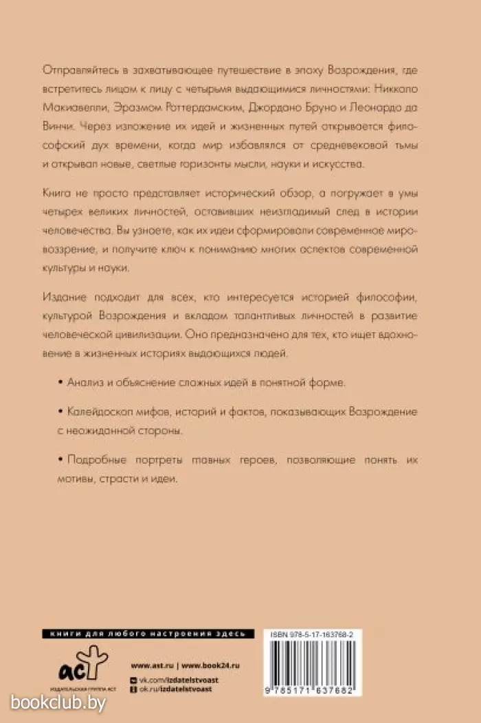 Отправьтесь в захватывающее путешествие в эпоху Возрождения, где встретитесь лицом к лицу с четырьмя выдающимися личностями: Никколо Макиавелли, Эразмом Роттердамским, Джордано Бруно и Леонардо да Винчи. Через изложение их идей и жизненных путей открывается философский дух времени, когда мир избавлялся от средневековой тьмы и открывал новые, светлые горизонты мысли, науки и искусства.