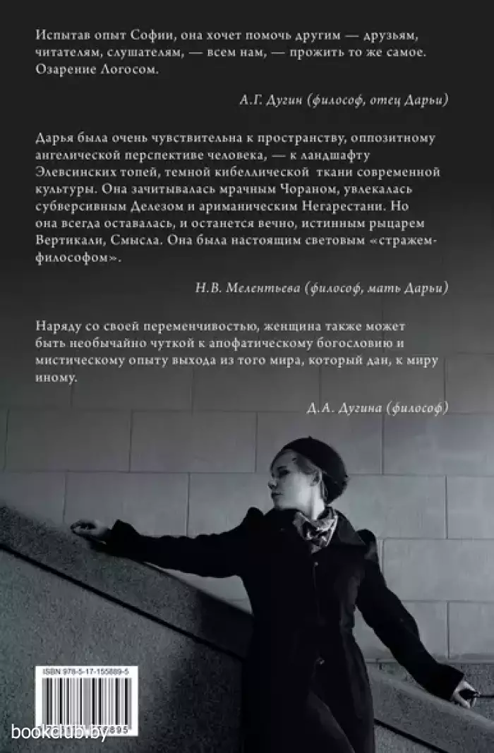 Книга философа-традиционалиста Дарьи Дугиной знакомит читателей с ее философскими идеями, с ее прочтением классического наследия философии, и прежде всего неоплатонизма, и современных авторов, с ее оригинальным учением "эсхатологического оптимизма". Книга составлена из научных статей автора, расшифровки ее лекций, семинаров и выступлений перед различными аудиториями. Это произведение является образцом огненного служения идеалам Традиции и духовным памятником борьбы против современного мира, что сама Дарья считала своей философской судьбой.