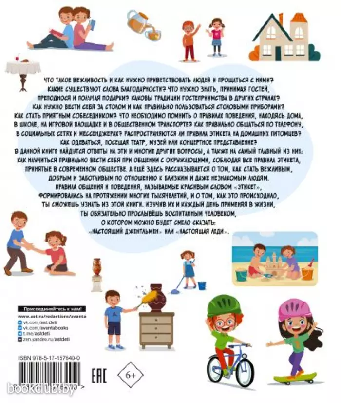 Данная книга — это увлекательное и практичное руководство, которое поможет детям освоить правила этикета и подскажет, как правильно вести себя в различных жизненных ситуациях. В ней они найдут множество интересных историй, примеров и практических советов, которые помогут им разобраться в такой важной сфере, как общение. В нашем непростом мире очень многое зависит от того, как человек выстраивает гармоничные отношения с окружающими, и недаром известная пословица гласит: относись к другим так, как хотел бы, чтобы относились к тебе. Эта книга — не "учебник хороших манер", где просто описываются правила поведения: это практичный путеводитель, который, несомненно, поспособствует всестороннему и гармоничному развитию ребёнка, формированию таких незаменимых качеств и черт характера, как вежливость и воспитанность.
