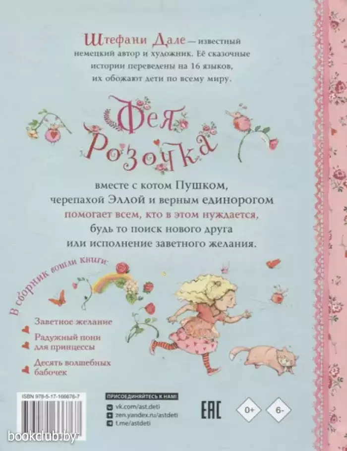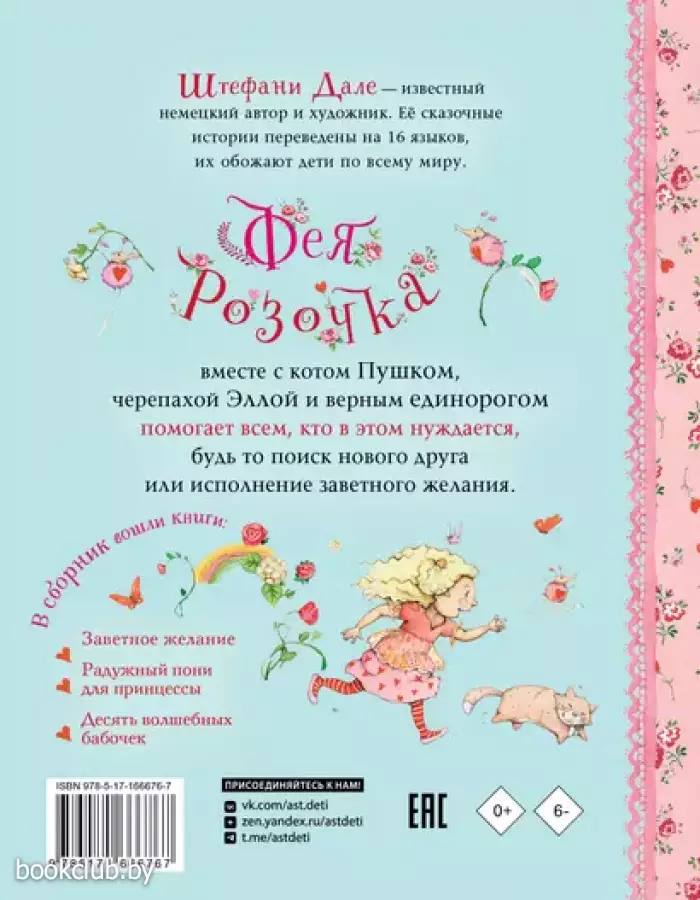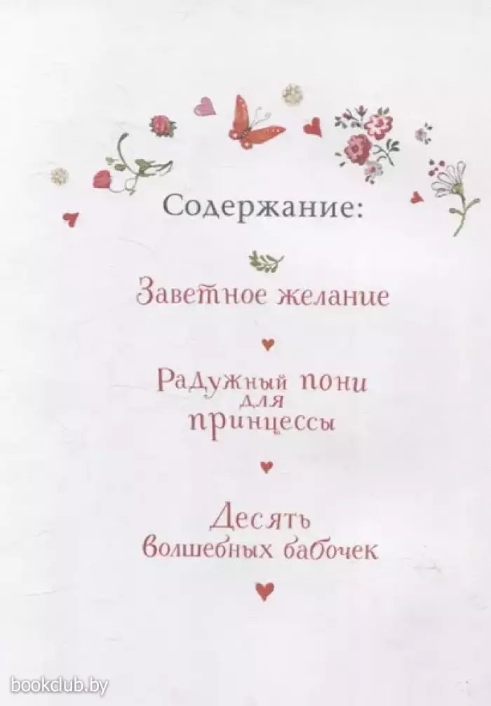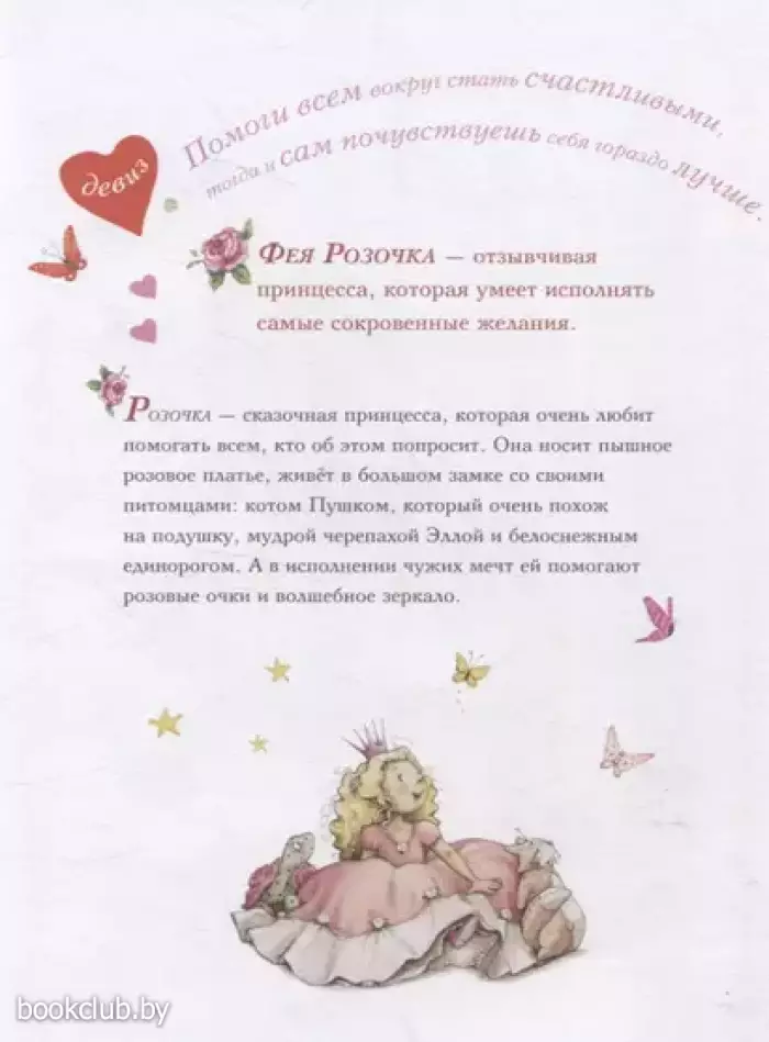 Сказочная принцесса фея Розочка живёт в замке и умеет исполнять самые заветные желания. Ей на помощь всегда приходят верные друзья: кот Пушок, черепаха Элла и белоснежный единорог. Вместе они отправятся на поиски подарка для принцессы Сисси и отыщут друга для маленькой шоколадной белочки. В сборник вошли истории «Фея Розочка. Заветное желание», «Фея Розочка. Радужный пони для принцессы», «Фея Розочка. Десять волшебных бабочек».
