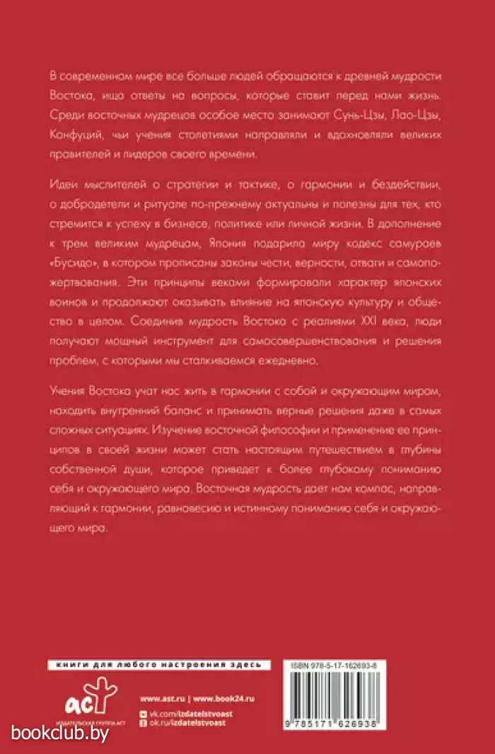 В современном мире все больше людей обращаются к древней мудрости Востока, ища ответы на вопросы, которые ставит перед нами жизнь. Среди восточных мудрецов особое место занимают Сунь-Цзы, Лао-Цзы, Конфуций, чьи учения столетиями направляли и вдохновляли великих правителей и лидеров своего времени. Идеи мыслителей о стратегии и тактике, о гармонии и бездействии, о добродетели и ритуале по-прежнему актуальны и полезны для тех, кто стремится к успеху в бизнесе, политике или личной жизни. В дополнение к трем великим мудрецам. Япония подарила миру кодекс самураев «Бусидо», в котором прописаны законы чести, верности, отваги и самопожертвования. Эти принципы веками формировали характер японских воинов и продолжают оказывать влияние на японскую культуру и общество в целом. Соединив мудрость Востока с реалиями XXI века, люди получают мощный инструмент для самосовершенствования и решения проблем, с которыми мы сталкиваемся ежедневно. Учения Востока учат нас жить в гармонии с собой и окружающим миром, находить внутренний баланс и принимать верные решения даже в самых сложных ситуациях. Изучение восточной философии и применение ее принципов в своей жизни может стать настоящим путешествием в глубины собственной души, которое приведет к более глубокому пониманию себя и окружающего мира. Восточная мудрость дает нам компас, направляющий к гармонии, равновесию и истинному пониманию себя и окружающего мира.
